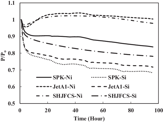 The swelling effect of nitrile and fluorosilicone O-rings in Jet-A1, SPK and SHJFCS with no added aromatics was compared (Fig. 5). Results show that the SHJFCS gave almost the same swelling effect as did Jet-A1 for nitrile O-rings. The high concentration of aromatics in Jet-A1 caused the swell rate of SHJFCS to be slightly lower than that of Jet-A1. Since there are no aromatics in SPK, neither elastomer immerged in SPK exhibited swelling; the nitrile O-ring exhibited swelling only in Jet-A1 and SHJFCS. The nitrile O-ring in Jet-A1 fuel started to swell in the fifth hour, almost the same time as that in SHJFCS fuel. The 5h delay in swelling was due to the chemical components being extracted from the fuel before swelling. This is different from O-rings immersed in SPK where, due to the absence of aromatics, extraction was followed by further shrinking. In Fig. 5 it is clear that the fluorosilicone seals shrank dramatically at the beginning of the test and further extracted until the end point. The shrinkage of seals in SHJFCS was not severe, unlike that of fluorosilicone seals in Jet-A1 and SPK. It can be said that the SHJFCS tried to maintain the elastomer condition by reducing the shrinkage process. The results show that the maximum P/Po value for nitrile in SPK is 1. This can be compared with the results in Fig. 5, showing only the extraction of nitrile seal in SPK during the whole test. It can be said that Jet-A1 and SHJFCS have their own aromatics that encourage the swelling of the O-ring, unlike SPK.