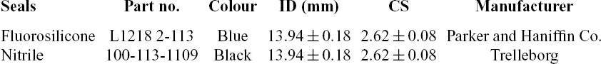 Three types of seals frequently being used in the aviation industry are fluorocarbon, fluorosilicone and nitrile seals. These seals are the most common seals found in an aircraft engine. The elastomers, such as O-ring seals, are used mainly in the engine parts and the hydraulic system to prevent leakage. Since the seals are made purely of rubber, they need to be changed after a period. This is because the elastomer starts degrading under different engine conditions. Studies done by Ewing(Reference Ewing2) showed that the fluorocarbon showed no degradation or changes when immersed and compressed in a fuel. Therefore, in the current study we used only fluorosilicone and nitrile seals.