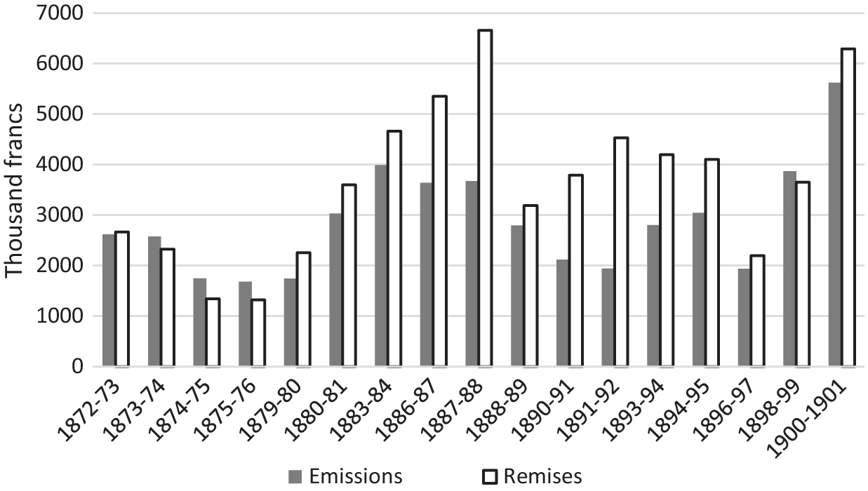 Figure 3. Changes in the amount of émissions and remises. Source: Commission de surveillance des banques coloniales, Rapport au président de la République sur les opérations des banques coloniales pendant l’exercice, annual volumes.