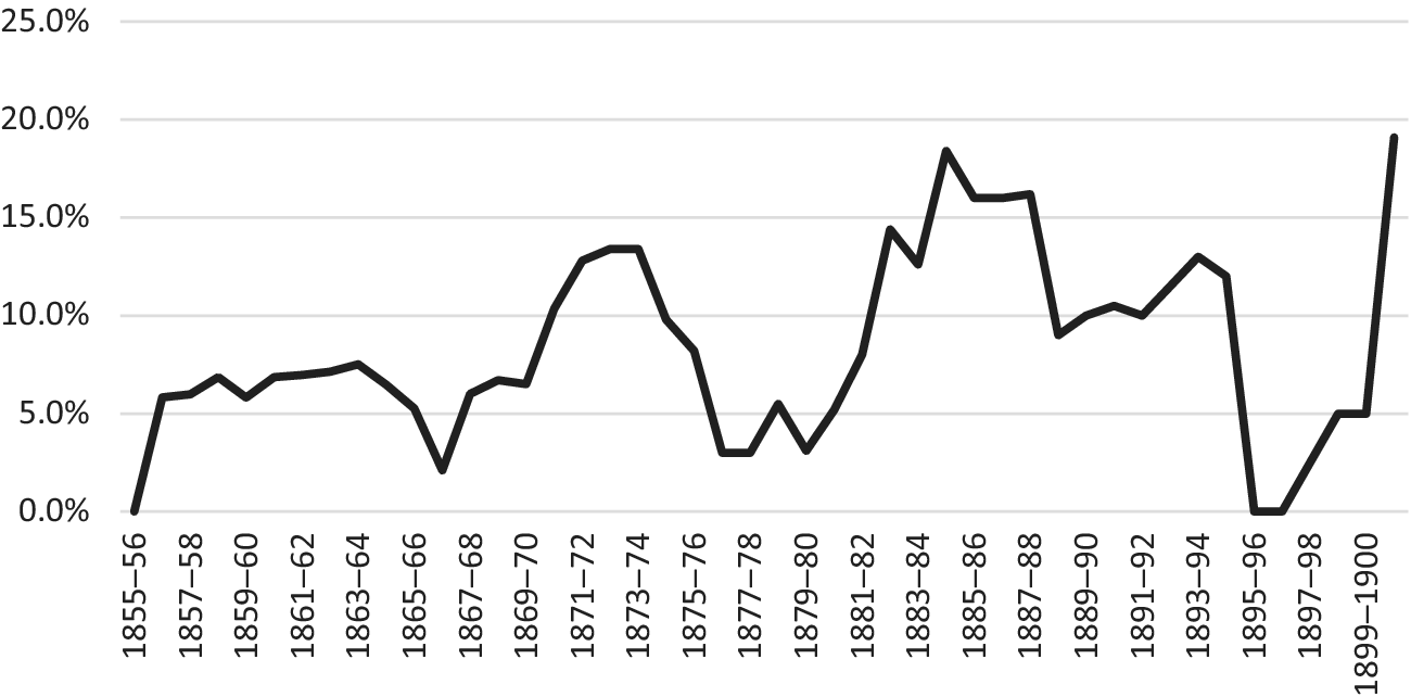 Figure 4. Dividend rate compared to the face value of a share (500 francs). Source: Author’s calculation based on Goumain-Cornille (Reference Goumain-Cornille1903).
