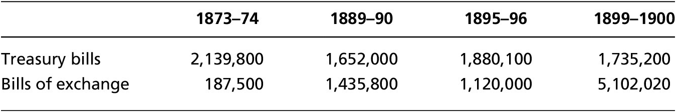 Although the remise operation was similar to the trade settlements used today, the remise operation conducted by public authorities was unique. Public authorities in Senegal procured local francs in exchange for treasury bills issued by the Ministry of the Navy and Colonies or the colonial government. After providing local francs to the bearers of these bills, the bank endorsed the bills and sent them to the designated credit institution in France. In exchange for the bill, the French Treasury credited the corresponding amount in metropolitan francs to the bank’s account at this institution (see Figure 2). Table 1 shows that, in the last quarter of the nineteenth century, the total amount of remise transactions made by the government was initially much larger than that of private entities. However, private transactions grew rapidly and became dominant by the end of the nineteenth century. The slowdown in the growth of public remise operations could have been caused by the launch of the postal money transfer service in Senegal in 1874 (Masaki Reference Masaki2021). In the colonies, postal money transfer services were executed through Treasury offices.