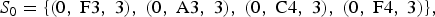 $$S_0 = \lcub \lpar 0\comma \; \hbox{F}3\comma \; 3\rpar \comma \; \lpar 0\comma \; \hbox{A}3\comma \; 3\rpar \comma \; \lpar 0\comma \; \hbox{C}4\comma \; 3\rpar \comma \; \lpar 0\comma \; \hbox{F}4\comma \; 3\rpar \rcub \comma \; $$