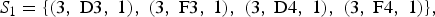 $$S_{1} = \lcub \lpar 3\comma \; \hbox{D}3\comma \; 1\rpar \comma \; \lpar 3\comma \; \hbox{F}3\comma \; 1\rpar \comma \; \lpar 3\comma \; \hbox{D}4\comma \; 1\rpar \comma \; \lpar 3\comma \; \hbox{F}4\comma \; 1\rpar \rcub \comma \; $$