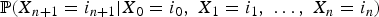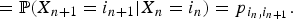 2. 2. ${\opf P}\lpar X_{n + 1} = i_{n + 1} \vert X_{0} = i_{0}\comma \; X_{1} = i_{1}\comma \; \ldots\comma \; X_{n} = i_{n}\rpar $$= {\opf P}\lpar X_{n + 1} = i_{n+1} \vert X_{n} = i_{n}\rpar = p_{{i_n}\comma i_{n+1}}.$