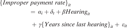 as well as uncertain temporal dynamics of remediation, we also estimate a time-forward linear effect of the hearing with the coefficient γ. This specification is somewhat unusual and so demands comment. Reforms to improve improper payments tend to require long-term investments in training, technology, and procedures along with learning about and revision to best practices. Thus we expect theoretically that the attention prompted by oversight hearings will not immediately improve improper payment rates but would, instead, improve rates as time passes and the agency implements reforms. Agency testimony supports this theoretical expectation, suggesting that reforms can take multiple years before fully effective.Footnote