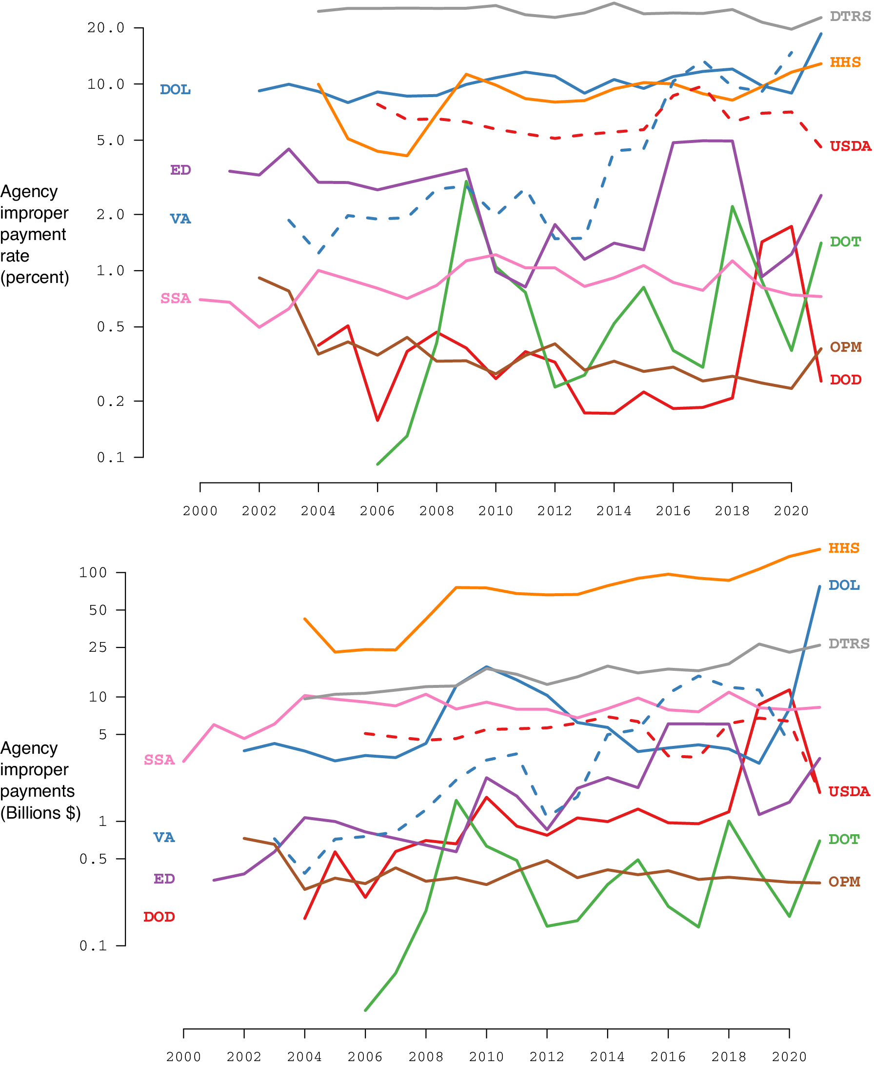 In Figure 1, we present agency-level trends in improper payments by year for the ten largest-outlay agencies. The top frame presents improper payment rate as a percentage of total payments, the bottom the dollar amount of improper payments. The top frame shows that the Department of the Treasury had the highest rate of improper payments during this time period with more than one out of every five dollars in outlays deemed improper. This is because the IRS has a hard time confirming the accuracy of payments for the Earned Income Tax Credit program. Other agencies with large rates of improper payments are Labor, Agriculture, and Health and Human Services (HHS), whose improper payment rates are on the order of 5– 10%.