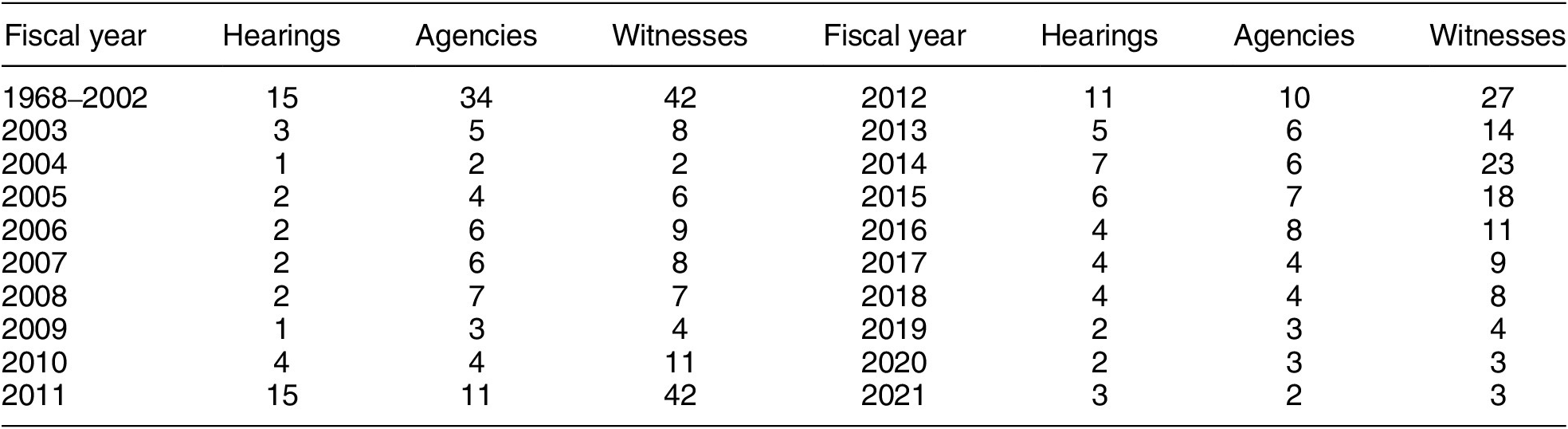 Improper payment hearings invite testimony from employees of executive agencies and programs. We use the affiliations of the bureaucratic witnesses to identify the agencies overseen in the hearing by matching witnesses to the 15 executive departments and 55 independent agencies in the federal government as defined by the Office of Personnel Management (we use the word “agency” to refer to the executive department or independent agency level).Footnote 8 Generally, these witnesses are Assistant Secretary or Director level within an agency or the Chief Financial Officer, Controller, Inspector General, or their deputies, of an agency or office within the agency. While hearings may mention certain programs or discuss program-level details, the witnesses invited have positions and job responsibilities at the agency-level and so we view improper payments hearings as agency-level stimulus. In Table 1, we summarize improper payment hearings held by Congress since 1968, tabulating the number of hearings, witnesses, and agencies called to oversight by fiscal year (summing across House and Senate). In Table A2 in the Supplementary Material, we tabulate the count of hearings by congressional committee, showing that improper payment hearings are mostly, but not exclusively, held by House and Senate oversight committees and Ways and Means.