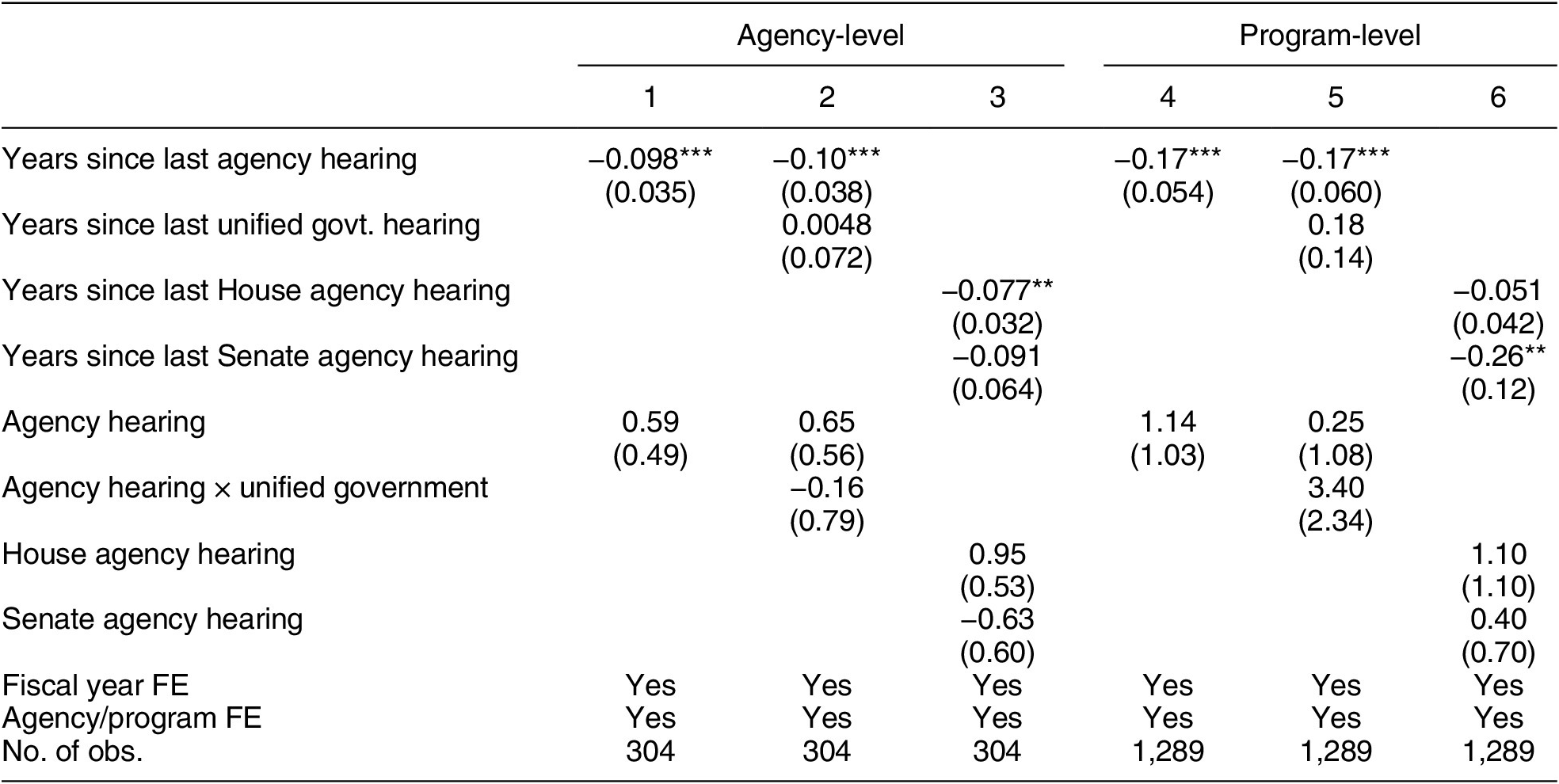 A first design choice is our specification of the effect of an oversight hearing as linear in the years following the hearing. To probe the empirical robustness of our result to the linear specification, we estimate two alternative regression specifications that allow for different dynamic effects of oversight hearings. In Table A4 in the Supplementary Material, we first estimate an intercept-shift model where instead of the effect of a hearing evolving linearly in the years after the hearing, we instead estimate an intercept-shift in average improper payment rate in all years after the hearing. Both agency- and program-level results suggest oversight leads to an average 1.5 percentage points lower improper payment rate in the fiscal years following a hearing.