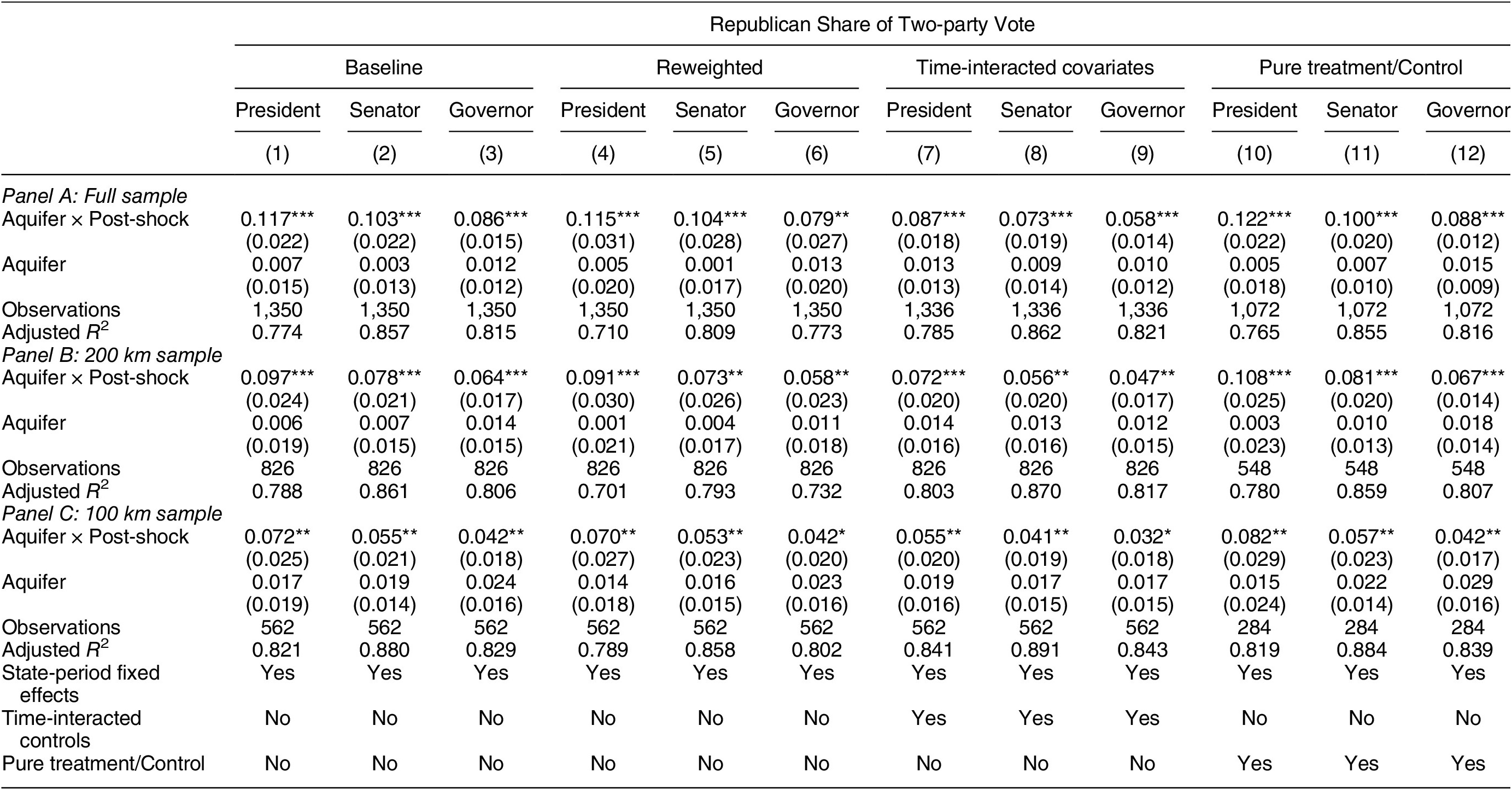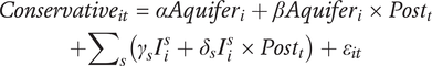 represents a pooled estimate of the change in conservative voting from the pre- to the post-shock period, comparing across counties with more versus less aquifer coverage within the same state. This is identical to estimating a difference-in-differences regression separately for each state and then constructing a weighted average of the estimated effects.Footnote 8