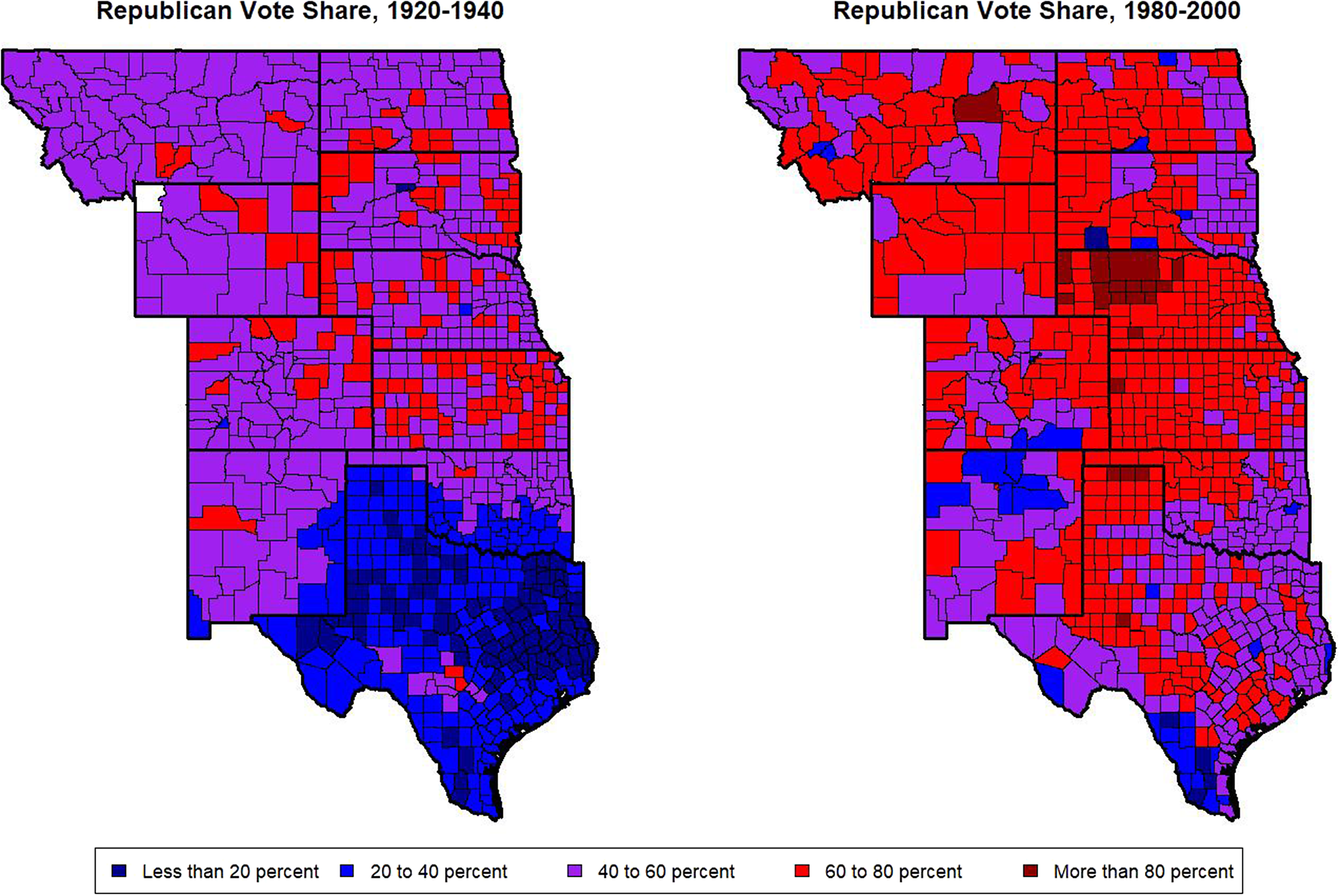 Figure 1 provides systematic data on this long-term political transformation, providing a map of Great Plains counties shaded according to the Republican Party’s percentage of the two-party vote in presidential elections between 1920 and 1940 in panel A and between 1980 and 2000 in panel B. As the map illustrates, over this period, the Great Plains evolved from a mostly “purple” (centrist) region into a consistently “red” (pro-Republican) region in elections.
