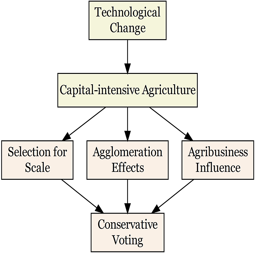 Long-term technological change made agriculture more productive but also more capital-intensive, generating economies of scale that resulted in the winnowing of unproductive and precarious family farms, and their replacement by highly productive, business-like farms as well as the spatial agglomeration of agricultural industries—known jointly as agribusiness—which benefit from conservative economic policies, including limited government regulation and pro-business tax and spending policies. The growing economic and political power of agribusiness interests in rural areas has, this paper argues, played an important role in the long-term conservative transformation of rural political preferences and the growing electoral success of the Republican Party in rural areas.