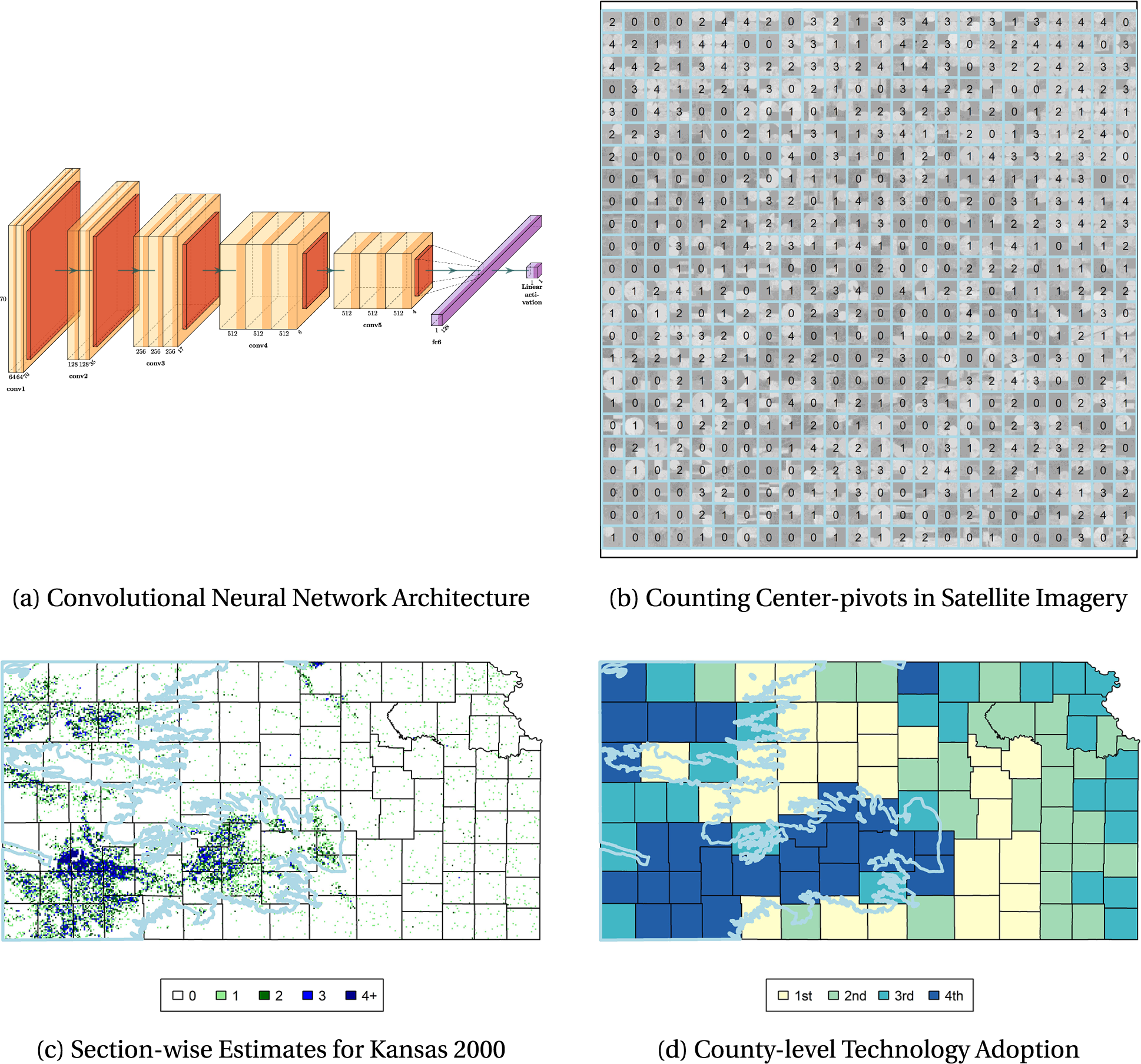 To validate this source of variation in exposure to technological change that underpins our empirical strategy, we develop estimates of the diffusion of center-pivot irrigation, using tools from the field of computer vision to develop remote-sensing measures of the technology’s signature circular cropping patterns in Landsat imagery. A detailed discussion is provided in the Supplementary material. In brief, we train a CNN to count the number of center-pivot irrigation circles observable in Landsat satellite imagery across counties in the Great Plains. CNNs are supervised learning algorithms that take images as input and as output make predictions about image characteristics, in our case an estimate of the number of visible center-pivots in a given image.