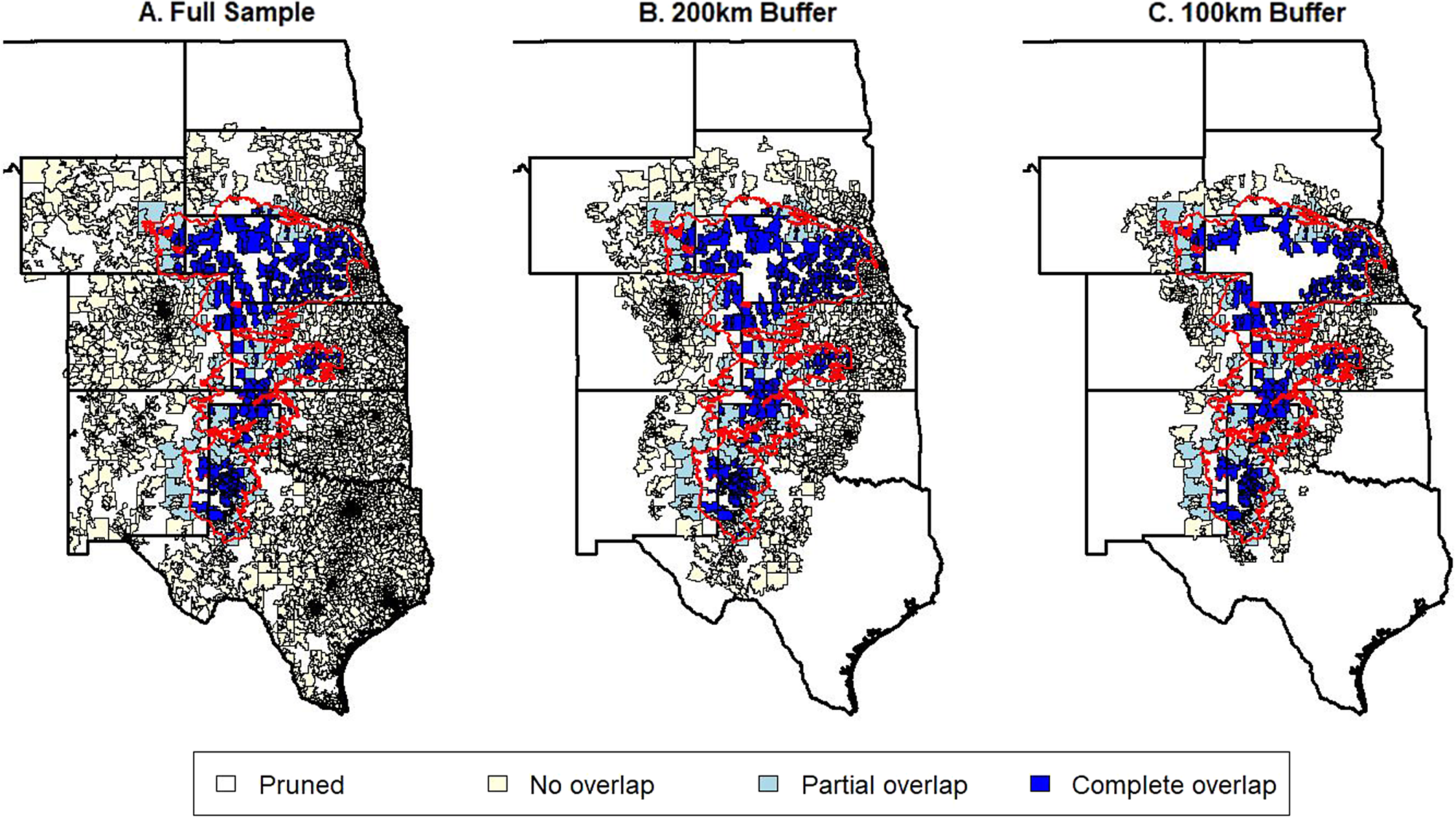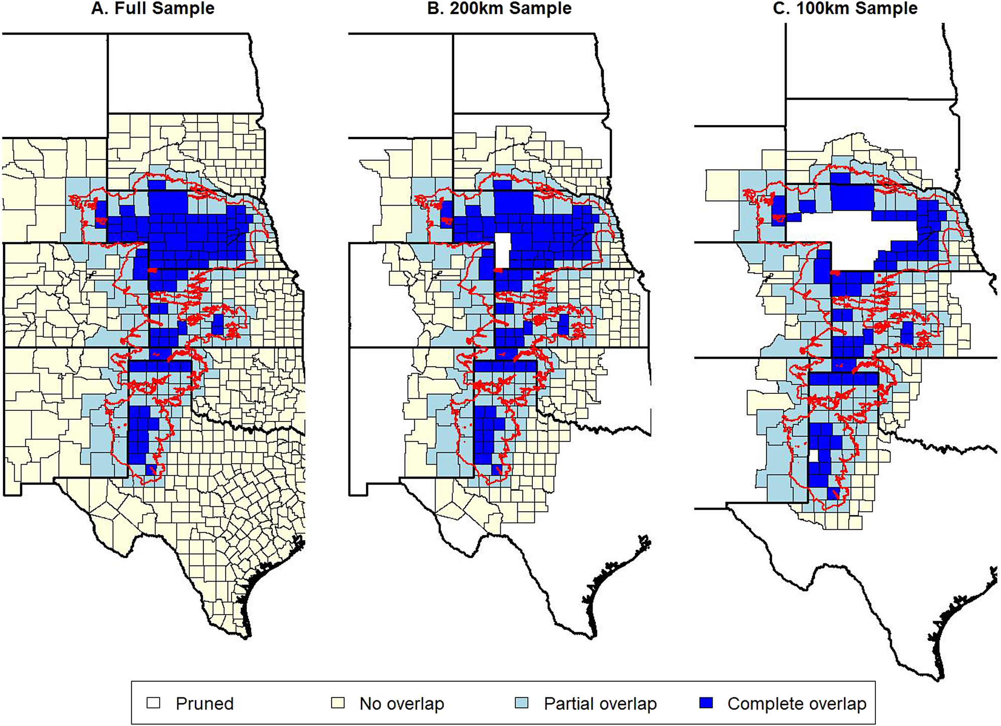 By limiting analysis to spatially proximate counties, we mitigate concerns about potentially confounding nonparallel trends that may result from comparing dissimilar counties that are located far away from each other. However, another concern that arises is spatial spillovers—exposure to the technological shock potentially impacts the economies and electoral outcomes of nearby counties. To address this concern, in some specifications we prune counties on the boundary itself, so that the sample is restricted to “pure” treatment (completely within the aquifer) and control (completely outside of the aquifer) counties with the buffer layer of partially intersecting counties in between and most at risk for spillovers pruned from the sample. Figure 4 depicts a comparison of the counties that are included in the full sample and those that are included in the spatially matched samples.