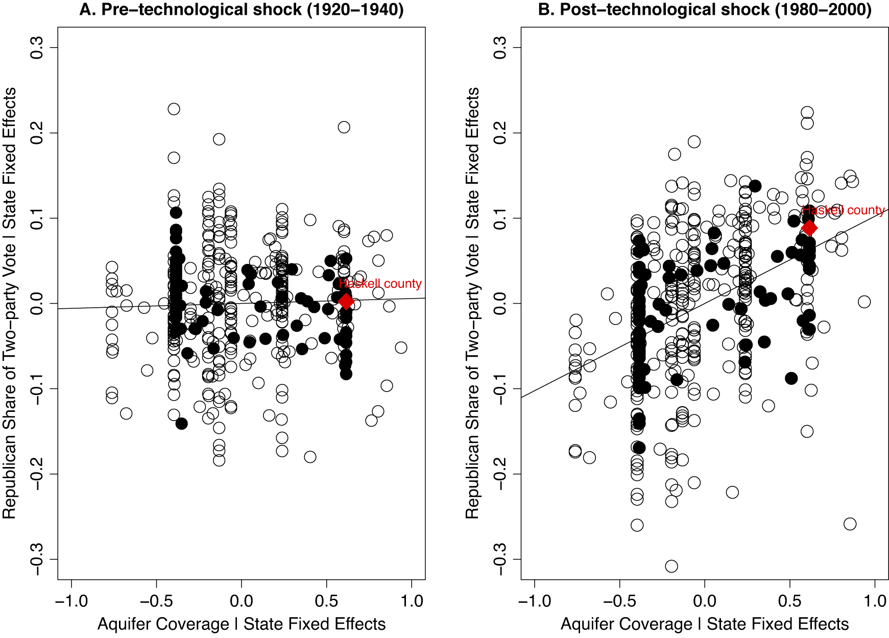 Empirically, we use geographic information system (GIS) analysis to measure the share of county land overlying the Ogallala Aquifer. We link this information to county-level panel data on the Republican Party’s share of the two-party vote in presidential, senatorial, and gubernatorial elections between 1920 and 2000. Difference-in-differences analyses—which in preferred specifications prune the sample of counties to 200-km and 100-km buffer zones along the boundary of the Ogallala Aquifer in each state and also control for state-time-period fixed effects—indicate that technological change played a large role in the region’s long-term conservative electoral transformation. Decade-by-decade analyses suggest that a positive association between aquifer coverage and conservative voting emerged precisely when the new irrigation technologies were introduced and was not driven by potentially confounding pre-trends.