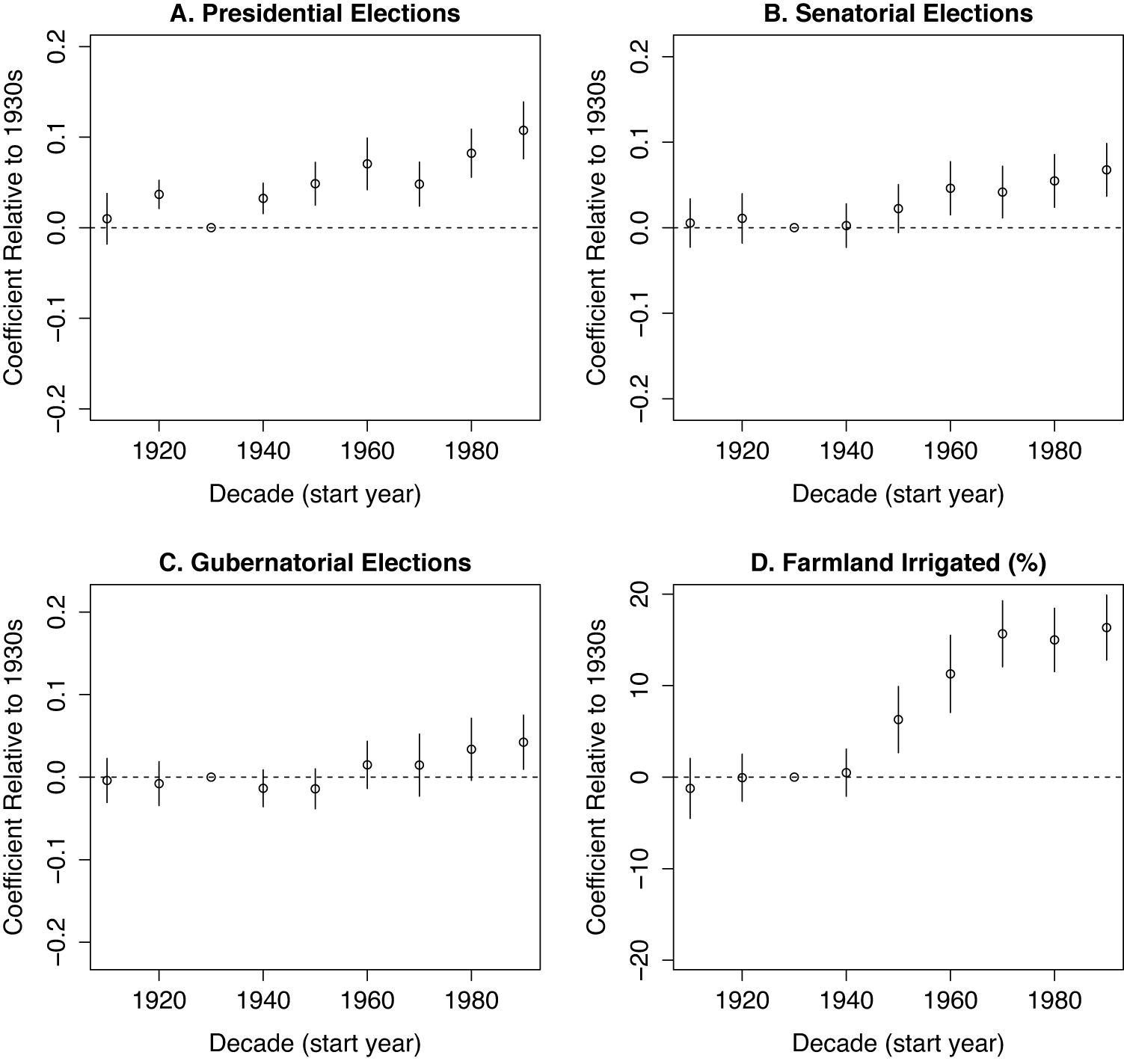 Figure 6 subjects the association between aquifer coverage and conservative voting to statistical tests for pre- and post-shock trends by omitting the interaction term between aquifer coverage and the dummy variable indicating the 1930s (the decade preceding the introduction of the new irrigation technology) and including state-year fixed effects and county fixed effects (to deal with sample selection issues as some counties drop out in the 1910s). This permits an analysis of whether the relationship between aquifer coverage and outcomes displayed a statistically detectable difference relative to that existing in the 1930s. As panels A through C indicate, there was no visibly confounding pre-trend in the estimated relationship between aquifer coverage and conservative voting prior to the technological shock, but a large positive trend emerged thereafter, due to the disproportionate spread of irrigation to counties with greater aquifer overlap from the 1940s onward as documented in panel D.