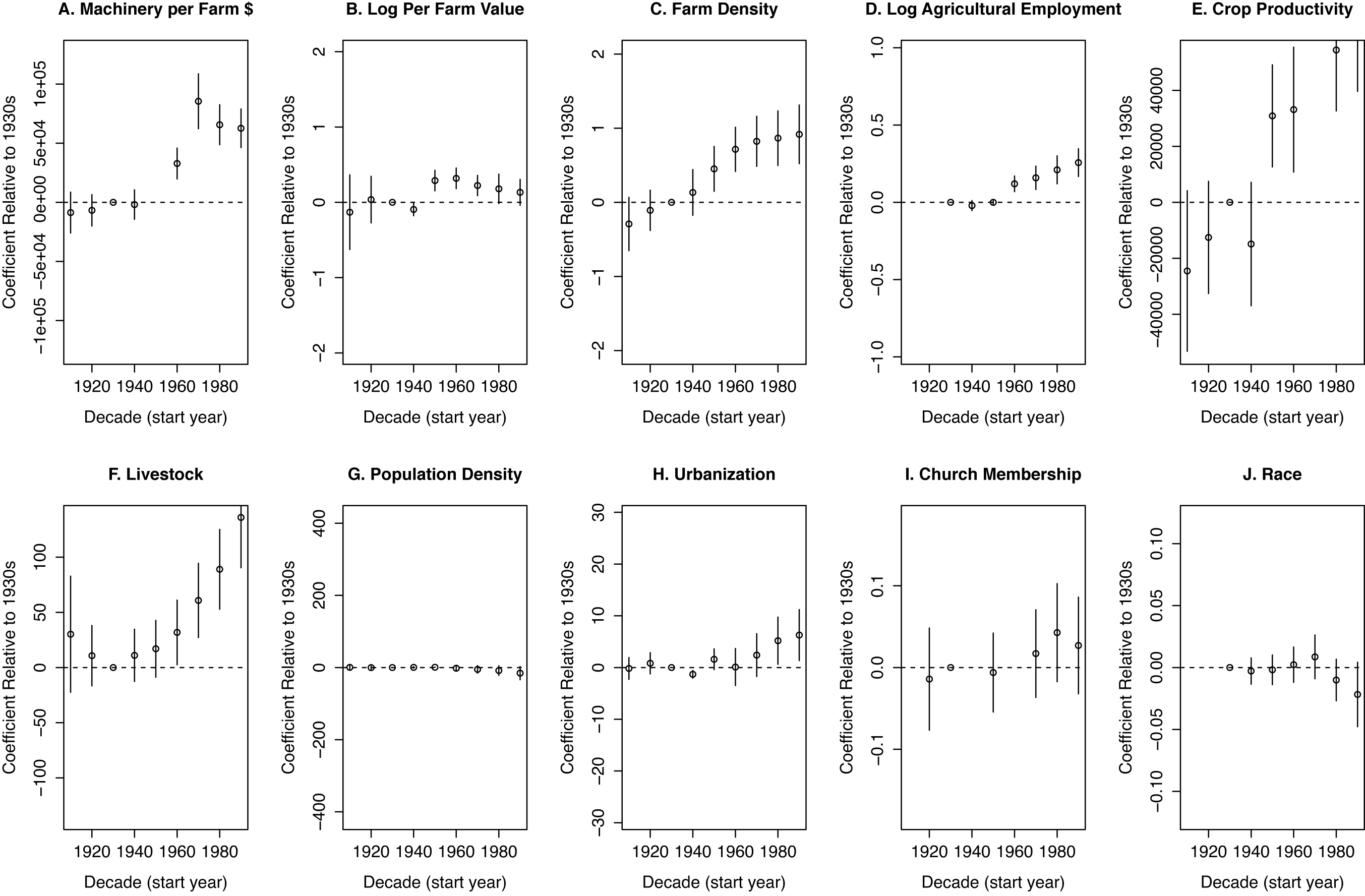 Notes: Unit of analysis is county-year (agricultural, population, or religious census year depending on outcome). Machinery is market value of machinery. Average farm value is market value of farm land and buildings. Farm density is the number of farms per 1,000 acres of county land. Agricultural employment is the percentage of workforce employed in farms. Crop production per farm is total value of crop production divided by number of farms. Livestock is the total number of cattle and pigs divided by the number of farms. All dollar amounts adjusted for inflation to 2016 dollars. Population density is the number of people per 1,000 acres of county land. Urbanization is the percentage of the county population living in census-defined urban areas. Religiosity is church membership per capita. White share is white share of population. Analysis estimated by OLS. Standard errors adjusted for clustering by county and state-year. *p