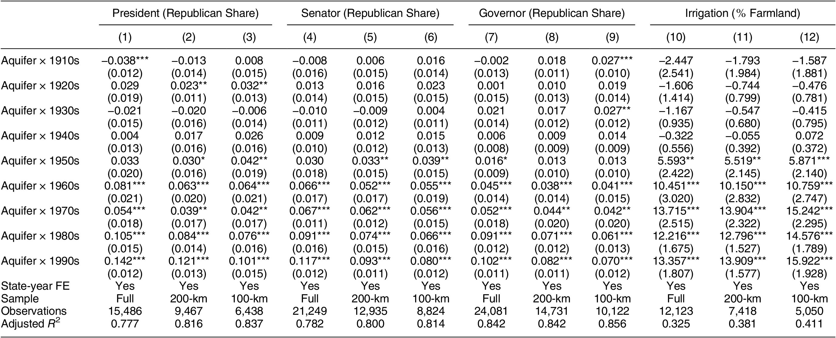 Table 3 reports coefficients from flexible specifications using a full county-year panel dataset of election returns and reporting coefficients on decadal dummy variables interacted with the aquifer coverage variable, controlling for state-year fixed effects. The coefficients in columns (1)–(9) indicate that across empirical samples and type of election, there was no statistically detectable association between aquifer coverage and conservative voting in the 1910s, 1920s, and 1930s and that this null relationship was stable until a positive relationship began to emerge exactly when the new irrigation technologies were introduced. These effects grew over time, consistent with the gradual uptake of irrigation technologies. Columns (10)–(12) report a parallel set of results for the spread of irrigation. These show that, prior to the availability of technology needed to exploit groundwater at scale, there was no association between county-level aquifer coverage and irrigation but a large and positive relationship that emerged from the post-shock period onward.