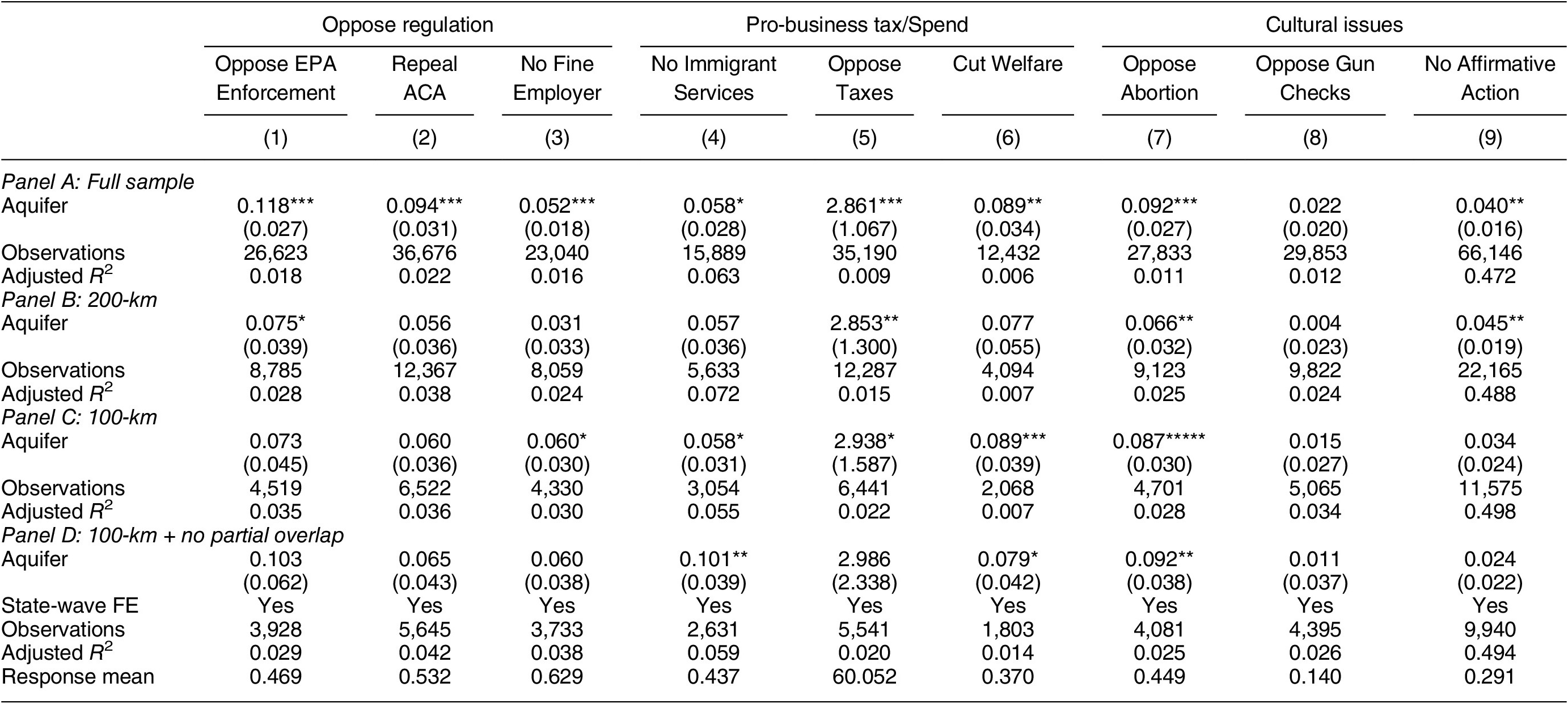 Table 5 reports the results, looking at how reported policy preferences differ across individuals living just inside versus outside of the boundaries of the Ogallala Aquifer on nine different issues reflecting conservatism on regulation, tax and spending, and cultural issues. Columns (1)–(3) of panel D (the preferred specification) indicate that people living just inside the boundaries of the Ogallala Aquifer are about 10.3 percentage points more likely to express opposition to strengthened enforcement of the Clean Air Act and Clean Water Act if it costs US jobs, consistent with the opposition of agribusiness interests to environmental regulation. They are about 6.5 percentage points more likely to support the repeal of the Affordable Care Act, which imposes health insurance mandates on large-scale employers of hired labor. Column (3) suggests that they are 6 percentage points more likely to oppose fines for employers hiring undocumented laborers, a practice common at agribusiness firms and farms. Some coefficients are imprecisely estimated, though this is due to a loss of statistical power as the sample is pruned; the coefficient estimates in panel D are virtually identical to those of specifications (in panels A through C) which use larger samples and report statistically significant coefficient estimates due to a greater number of observations and smaller standard errors.