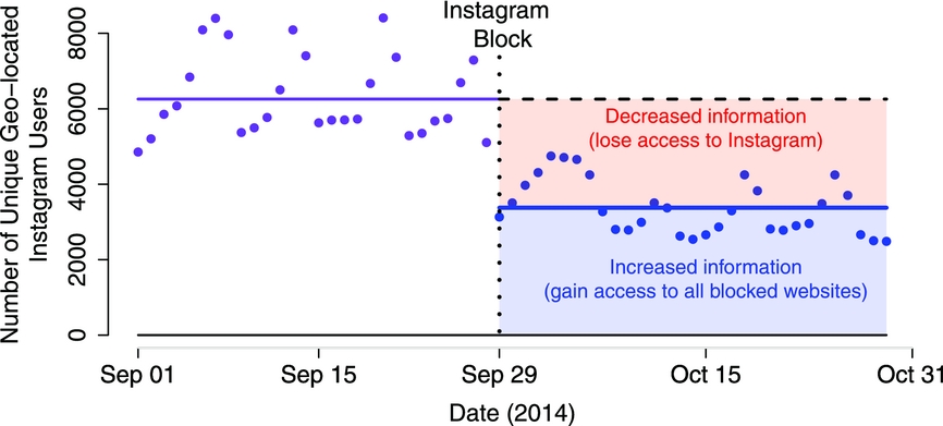 Importantly, these patterns of behavior were not forms of psychological reactance—such as a Streisand effect, where individuals explicitly seek out information that is being hidden. Instead, users gained access to more information simply by maintaining their current social media consumption (and there were fewer users of the newly blocked media itself). In blocking Instagram, the Chinese government reduced the number of users on Instagram, but increased access to websites that are typically more political such as Twitter, Wikipedia, and Facebook.