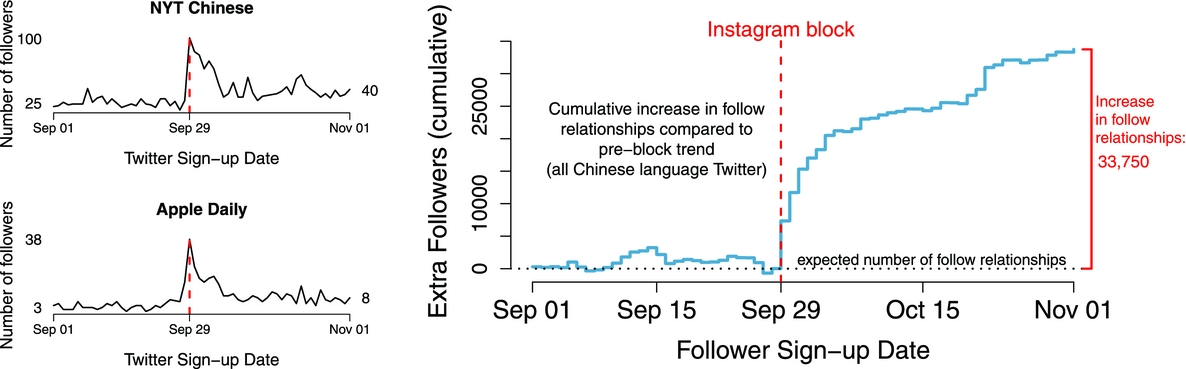 The Instagram block precipitated a large increase in followers for Chinese-language Twitter users, enhancing the network of the blocked website among mainland citizens. Not only did new users follow celebrities, they also began following political accounts, including accounts of news sites such as New York Times Chinese and Apple Daily (a Hong Kong news source highly critical of the mainland Chinese government). We show in the right panel of Figure 4 the total additional followers to these accounts, by day, compared to their average in the 30 days preceding the block. Overall, by November 1, there were 33,750 more followers of Chinese Twitter users than we would have expected based on data from the month before the block.