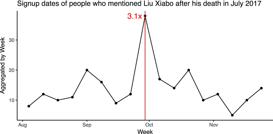 To assess whether the effects of the Instagram block continued despite increased efforts by the Chinese government to limit access to VPNs, we looked at the sign-up dates of Twitter users who discussed democracy activist and Nobel Peace Prize Laureate Liu Xiaobo after his death in July 2017. This was a simple test to see if we could still detect an effect of the 2014 block even three years later in 2017. We chose Liu Xiaobo because a mention of him was unambiguously political and explicitly censored in Mainland China, so we were unlikely to pick up false positives.Footnote 35 Liu Xiaobo was also a useful case because he died just before we revisited this analysis in late July 2017 and it was convenient for us to collect posts about him on Twitter as Twitter users were discussing his death.