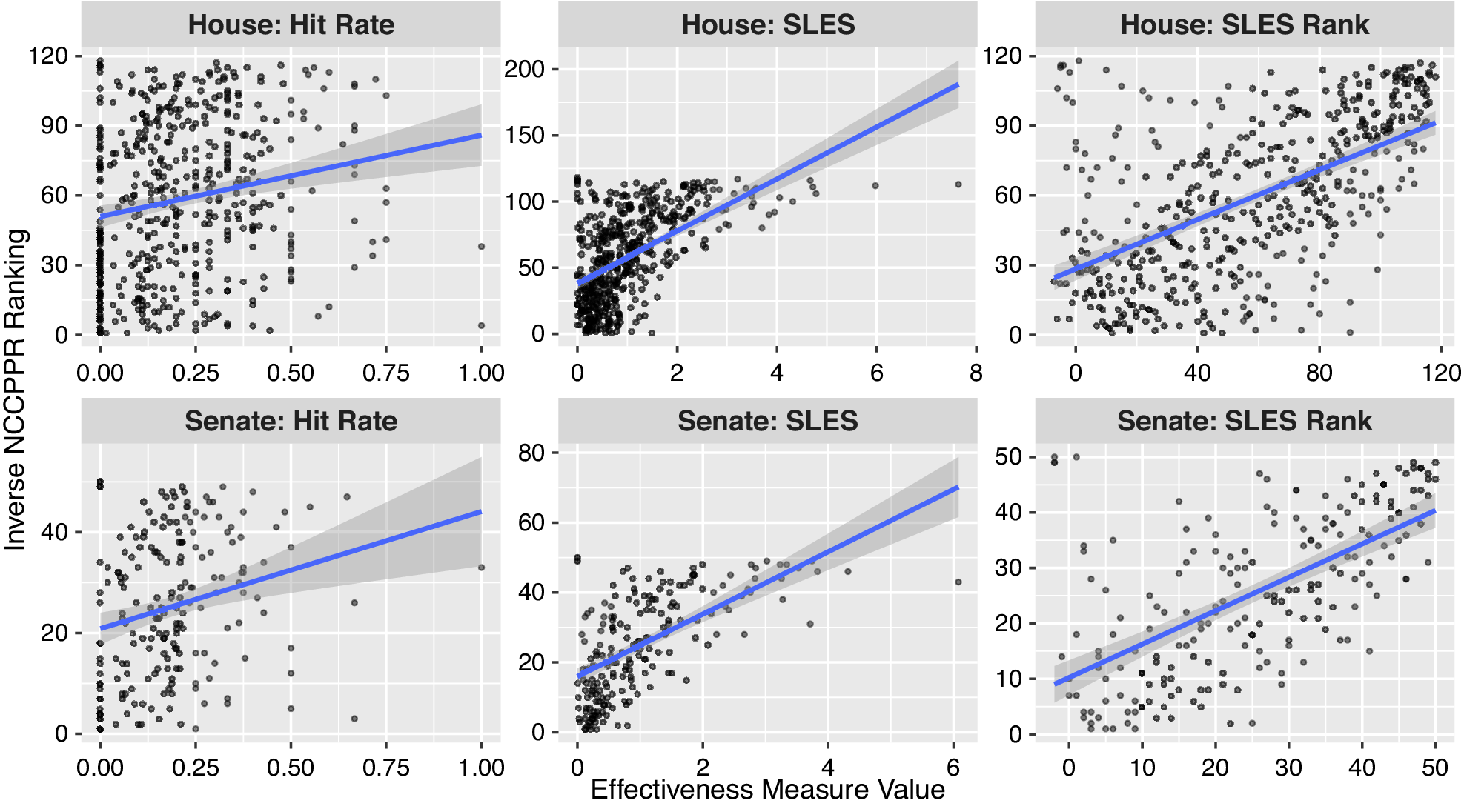 Note: The figure shows the relationship between the State Legislative Effectiveness Scores and the survey-based rankings from the North Carolina Center for Public Policy Research (NCCPPR). The top panel focuses on the North Carolina House, and the bottom panel focuses on the North Carolina Senate. The right and middle panels show the SLES scores (and especially the ranking version) correlate highly with the NCCPPR rankings, even more so than do simple “hit rates” in the left panel. Model specifications and results for the linear fit lines can be found in the main analysis file under Figure 1 on the APSR Dataverse (Bucchianeri, Volden, and Wiseman Reference Bucchianeri, Volden and Wiseman2024).