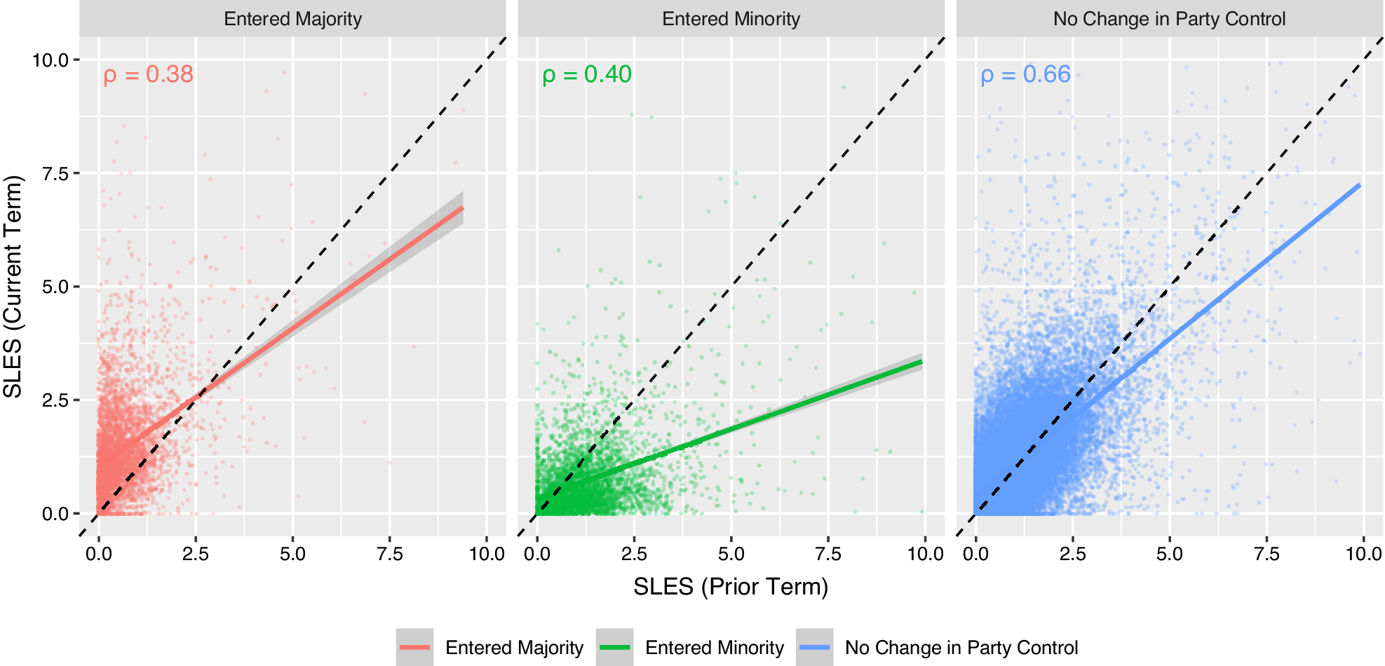 Note: The figure shows the relationship between the SLES and its lagged value for those who served in the state legislature in the previous legislative term. The correlation coefficients for each comparison are included in the upper left of each panel. The high degree of positive correlation indicates that the scores are tapping into underlying regular patterns of effectiveness rather than random or idiosyncratic considerations. As expected, the correlations are particularly strong in cases where majority-party control of the legislative chamber remained the same across consecutive sessions. Model specifications and results for the linear fit lines can be found in the main analysis file under Figure 2 on the APSR Dataverse (Bucchianeri, Volden, and Wiseman Reference Bucchianeri, Volden and Wiseman2024).