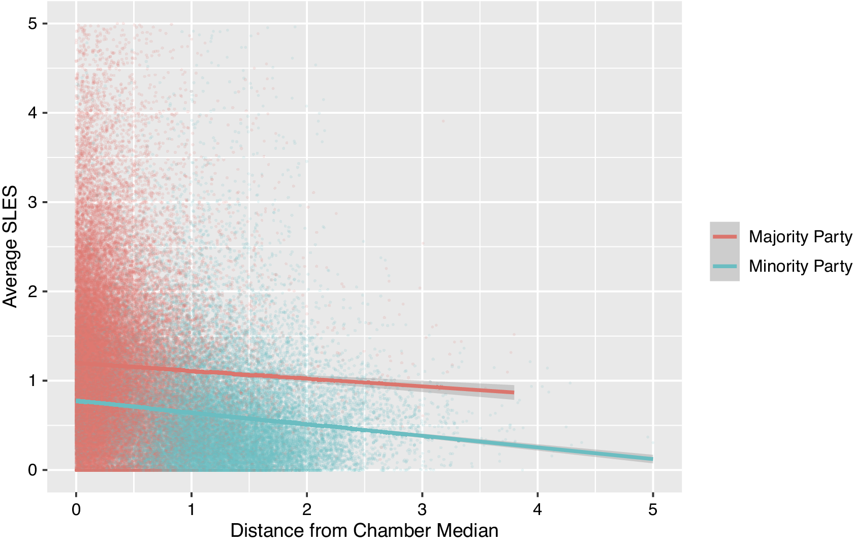 Note: The figure shows declining State Legislative Effectiveness Scores in both the majority and minority parties among those who deviate further from the legislative median, as based on ideological ideal points constructed by Shor and McCarty (Reference Shor and McCarty2011). Model specifications and results for the linear fit lines can be found in the main analysis file under Figure 4 on the APSR Dataverse (Bucchianeri, Volden, and Wiseman Reference Bucchianeri, Volden and Wiseman2024).