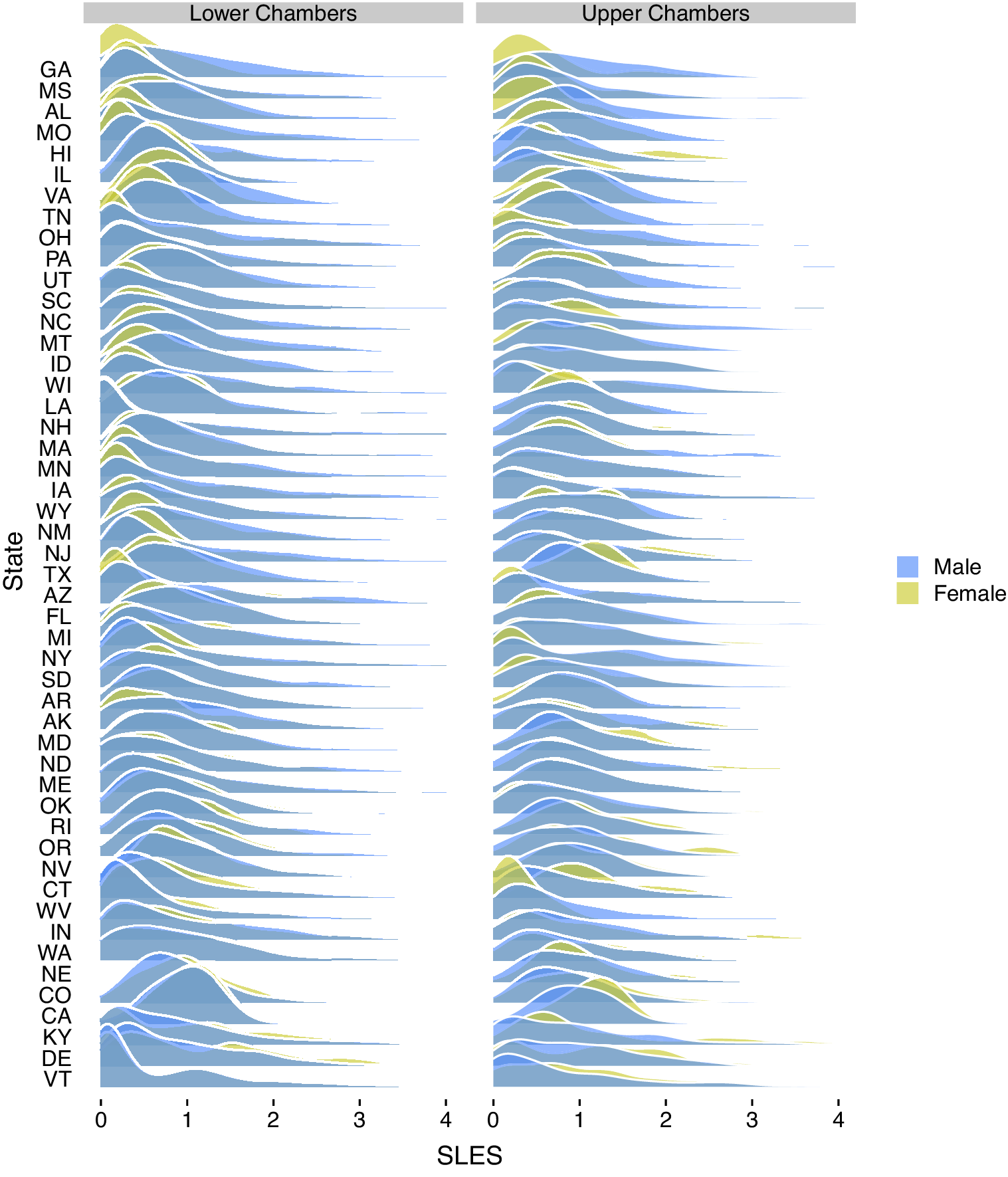 Although such scholarship has made remarkable progress in uncovering various conditions under which biases occur and how they are overcome, many studies in this area tend to be limited to a single legislature (i.e., Congress), or to a small handful of states, or a single period in time. One of the benefits of the approach offered here is the opportunity to explore the considerations raised above (all of which vary significantly over time and across states) across the more than 1,000 chamber-terms that we score. Indeed, as Figure 5 shows, there is significant variation across legislative chambers in the relative SLES of men and women. This variance provides significant opportunities for scholars to address when, where, and why lawmaking biases by gender (or race, or both) exist and how they might be overcome.