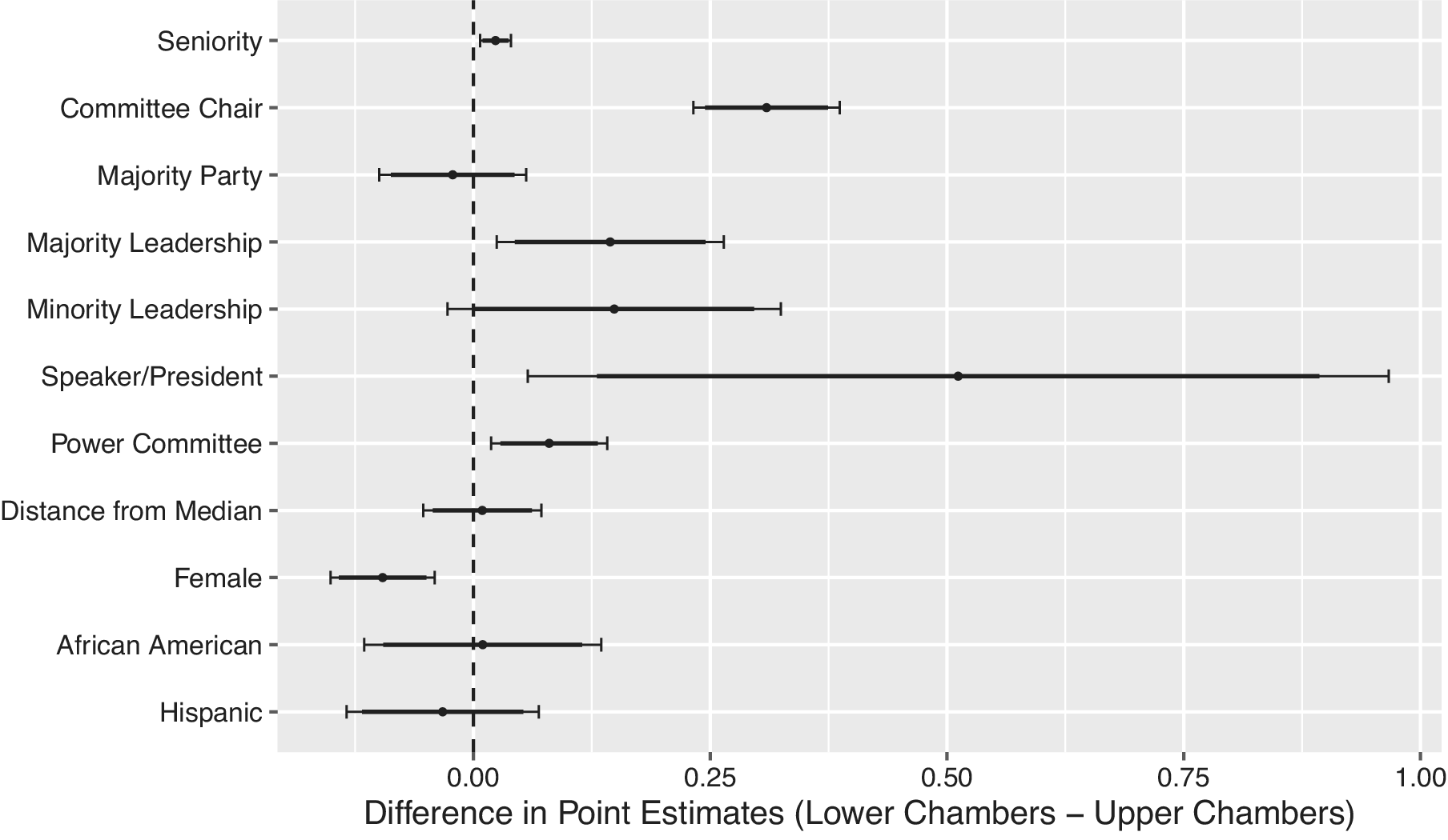 Note: This figure shows the difference in the coefficients from the two chamber-specific models in Table 1. Differences greater than 0 indicate the coefficient was larger in lower chambers, while those below 0 indicate it was larger in upper chambers. Confidence intervals are constructed from a regression model with all covariates interacted with a “lower chamber” indicator variable, with the thin and thick lines corresponding to 95% and 90% confidence intervals, respectively. Results show the importance of committee positions and party leadership in structuring lawmaking in larger (lower) chambers.