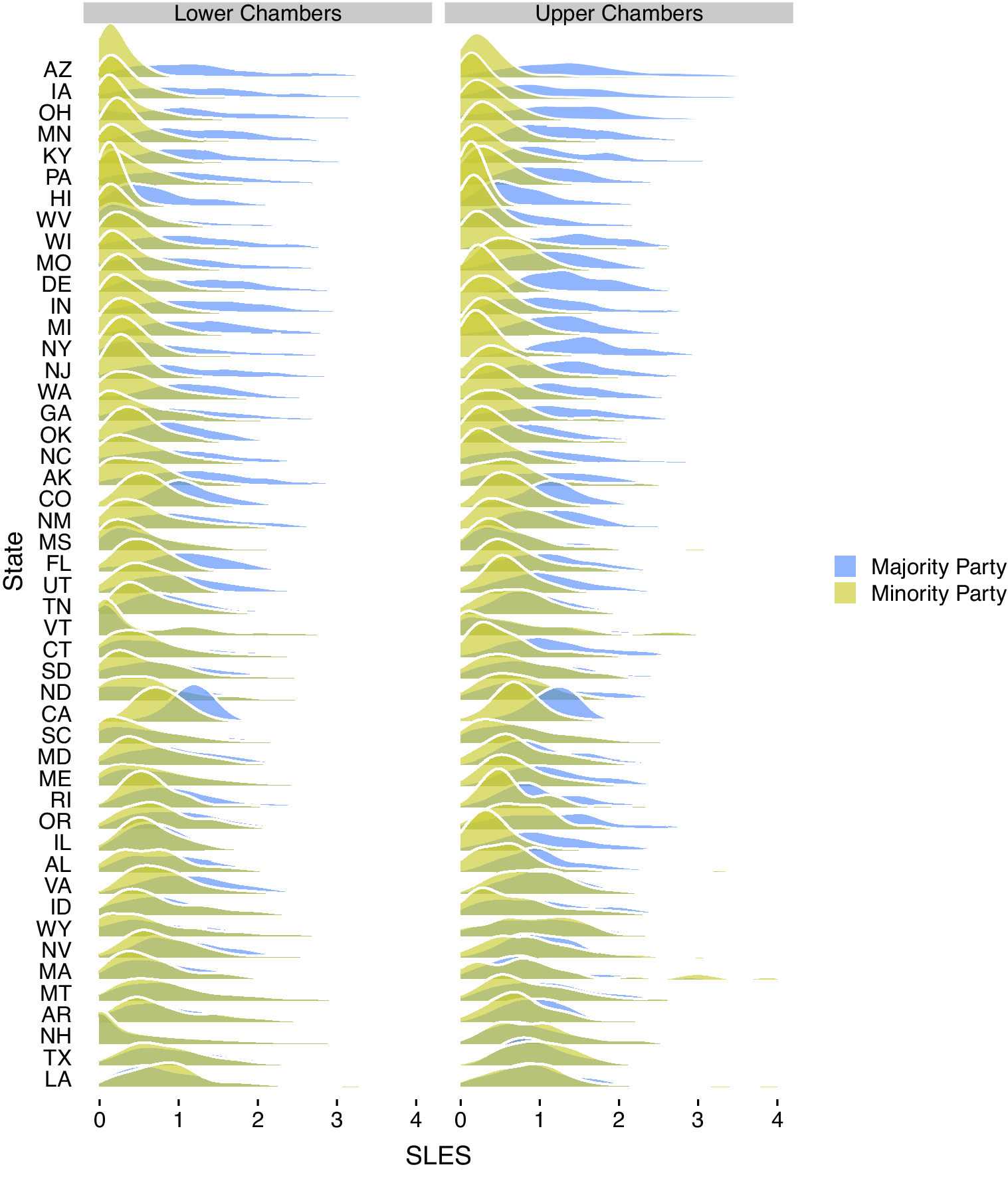In terms of SLES, Figure 7 illustrates the variation in majority-party and minority-party effectiveness. The blue distributions show the SLES for majority-party members, while the yellow distributions show the SLES for minority-party members. The states are sorted such that those with the largest majority-party advantage are near the top and those with a lesser advantage are near the bottom. Why might states like Arizona, Iowa, and Ohio feature such strong majority-party differences, while states like New Hampshire, Texas, and Louisiana see relatively small differences?