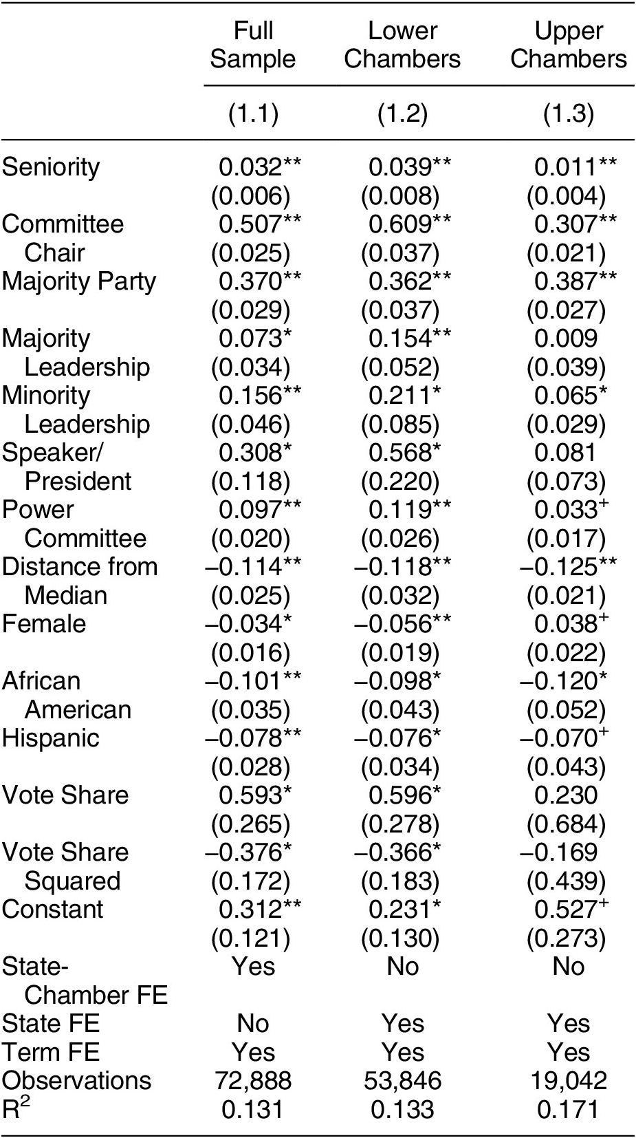 Note: +p < 0.1; *p < 0.05; **p < 0.01, two-tailed. Standard errors are clustered by state chamber.