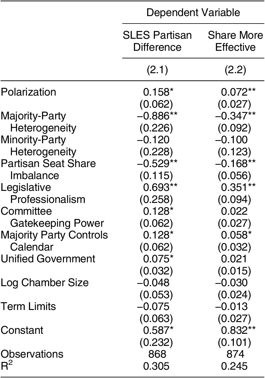 To test these two hypotheses—regarding conditional party government and insecure majorities—we move from the level of individual lawmakers, characterized in Table 1, to instead consider entire legislative chambers as our units of analysis. Specifically, each chamber in each two-year term is considered as an observation, and we create two dependent variables to explore the relative party strength within each of these chambers in comparison with each other. The first variable is the SLES Partisan Difference, which captures the median SLES value among majority-party members minus the median SLES among minority-party members. The second variable is Share More Effective, which measures the proportion of majority-party legislators whose SLES exceed the median SLES of minority-party members. For both variables, greater values indicate a larger majority-party advantage in the legislature, capturing the extent to which majority-party legislators are more successful at advancing their bills through the lawmaking process than are minority-party legislators.