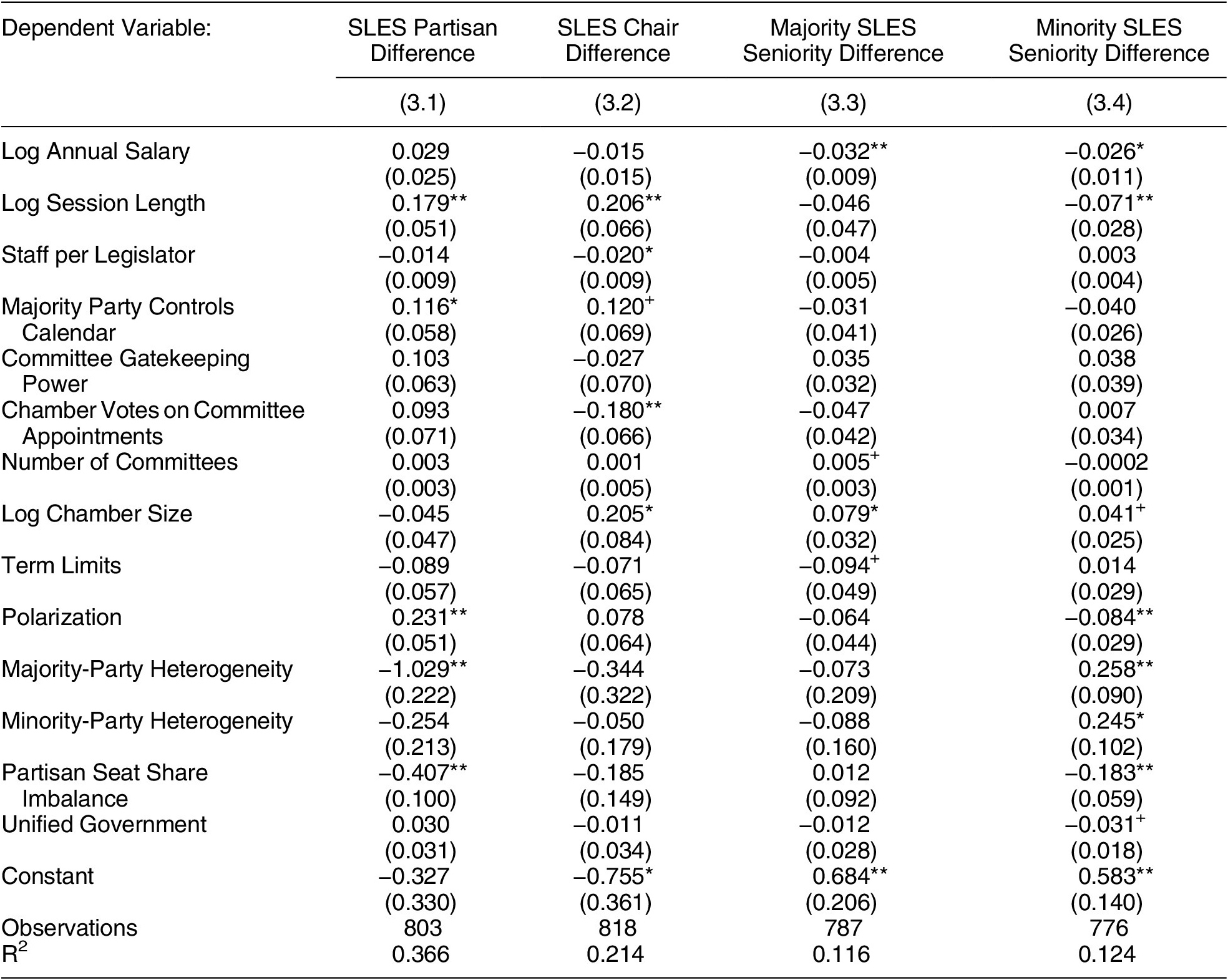 To explore these broad relationships of how chamber-level rules and conditions influence the relative power of groups of lawmakers, we again focus on chamber-level units of analyses. Our first dependent variable comes from the analysis reported in Table 2: SLES Partisan Difference, which captures the difference between the median SLES values in the majority and minority parties. We build on this approach to model our other dependent variables. SLES Chair Difference captures the median SLES among committee chairs minus the median SLES among rank-and-file legislators.Footnote 15 SLES Seniority Difference captures the median SLES among non-freshmen legislators minus the median SLES among freshmen, which we examine separately for those in the minority party and the majority party (due to differences in whether freshmen are more likely to be in one party or the other). Across these four dependent variables, we should be able to gain an understanding of some important power dynamics within American state legislatures.