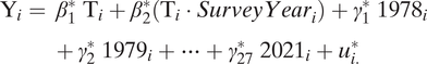 If VDL-induced attitude change diminishes over time, the average treatment effect across GSS surveys from 1978 to 2021 represents a high bar, as more than half of the respondents in our sample were interviewed after 1996, approximately 25 years after the Vietnam Draft Lotteries. The regression results based on Equation 2 indicate the rate at which effects decay. The lower panel of Table 1 reports the treatment-by-time interaction (