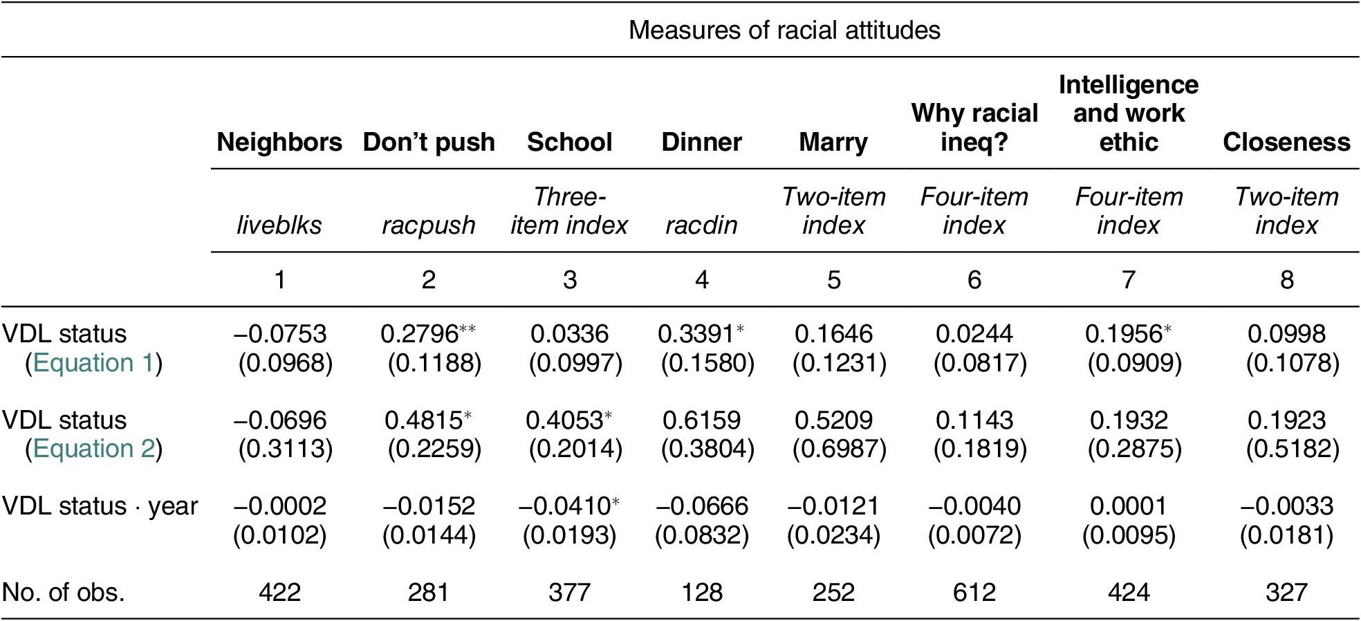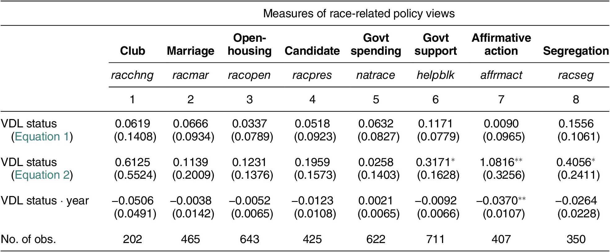 3 present regression results for measures of racial attitudes, race-related policy and candidate preferences, and general political orientations, respectively. The tables report the average effect of VDL status (