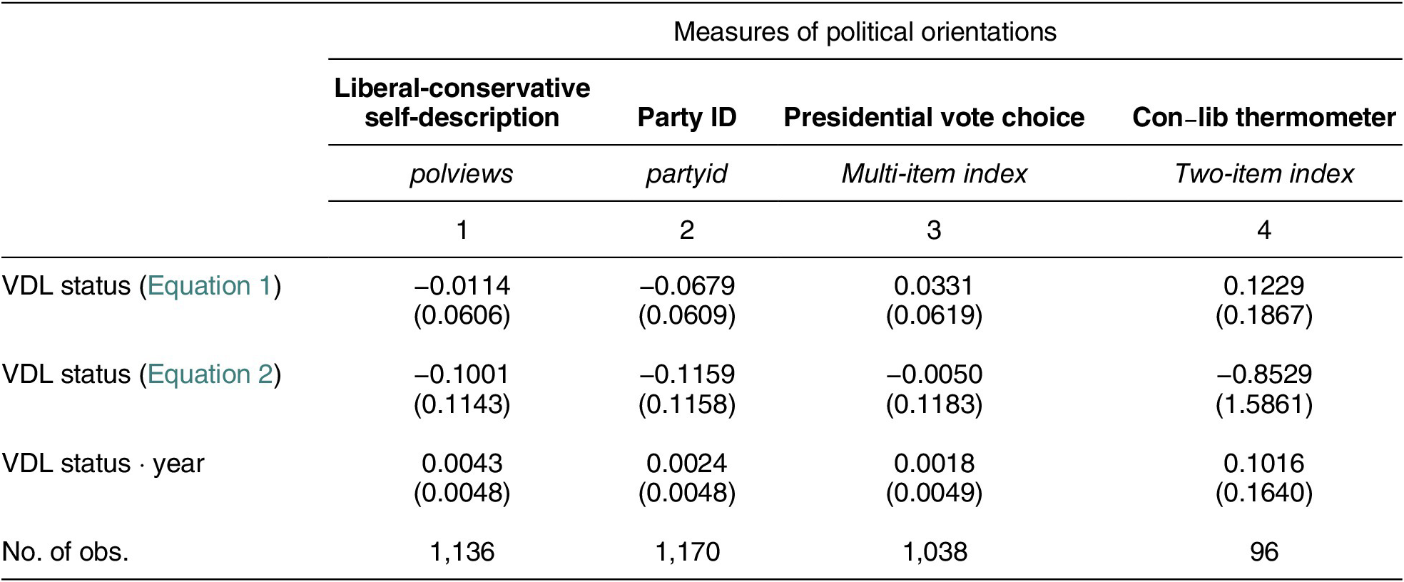 estimates suggests that the VDL-induced liberalization of racial attitudes that manifested in early GSS surveys may have moved political attachments and candidate choices to the left initially, but the statistical evidence is faint. See Section SI 7.3 of the Supplementary Material for evidence suggesting weak VDL effects on a range of other preregistered issues, but see Section SI 10.1 of the Supplementary Material on possible effects on other issues that were not part of our pre-analysis plan but were suggested by reviewers.
