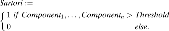 $$Sartori := \left\{ {\matrix{ 1 \hfill 	 \,\,{if\;Component_1 , \ldots ,Component_n> Threshold} \hfill \cr 0 \hfill 	 {else.} \hfill \cr } } \right.$$
