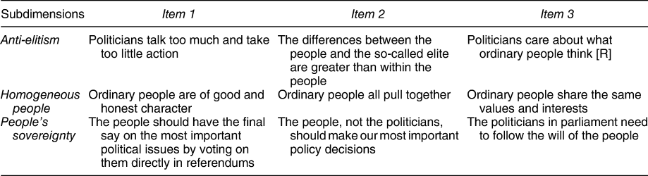 In this study, we take a step back and consider some unresolved problems regarding the concept structure of populism at the individual level. Responding to criticism that populist attitudes do not provide any theoretical import to the established public opinion literature, populism scholars have devotedly been discussing the conceptual core of populist attitudes, thereby achieving a notable convergence about the concept’s essential characteristics (Rooduijn Reference Rooduijn2019). Most scholars now concur that populist attitudes denote a multidimensional construct, composed of two or more concept components (Akkerman, Mudde, and Zaslove Reference Akkerman, Mudde and Zaslove2014; Castanho Silva et al. Reference Castanho Silva, Andreadis, Anduiza, Blanusa, Corti, Delfino, Rico, Ruth, Spruyt, Steenbergen, Littvay, Hawkins, Carlin, Littvay and Kaltwasser2018; Mudde and Rovira Kaltwasser Reference Mudde and Kaltwasser2013a; Oliver and Rahn Reference Oliver and Rahn2016; Schulz et al. Reference Schulz, Müller, Schemer, Wirz, Martin and Wirth2018; Stanley Reference Stanley2011). Although unanimity has not yet been reached about the exact content of these components, there is widespread agreement on the idea that populist attitudes lie at the intersection of the concept’s subdimensions (Castanho Silva et al. Reference Castanho Silva, Andreadis, Anduiza, Blanusa, Corti, Delfino, Rico, Ruth, Spruyt, Steenbergen, Littvay, Hawkins, Carlin, Littvay and Kaltwasser2018; Hameleers, Bos, and Vreese Reference Hameleers, Bos and de Vreese2017, 482; Hieda, Zenkyo, and Nishikawa Reference Hieda, Zenkyo and Nishikawa2019, 3; March Reference March2017, 283; Mudde and Rovira Kaltwasser Reference Mudde and Kaltwasser2013a, Reference Mudde, Kaltwasser, Freeden, Sargent and Stears2013b, 149; Spruyt, Keppens, and van Droogenbroeck Reference Spruyt, Keppens and van Droogenbroeck2016, 336, but see Hameleers, Bos, and Vreese Reference Hameleers, Bos and de Vreese2017, 482).Footnote 1 In other words, the supposed unique property of populist attitudes is the coexistence of its components. Hence, what distinguishes populist attitudes from similar attitudinal concepts is its status as an attitudinal syndrome, which only considers citizens as populists if, for instance, they accept anti-elitist views and a Manichean outlook and believe in unrestricted popular sovereignty. However, existing studies on populism at the mass level rarely transfer this crucial concept feature into empirical practice. Because of the apparent mismatch between the theoretically derived concept specification and the concept’s operational use, many populism studies do not measure what they are intended to measure, and therefore, the reported results do not necessarily speak about the concept under investigation.