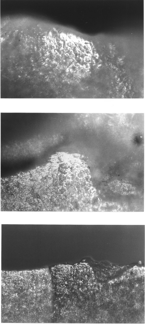 Examples of use wear on chert bifacial points from Aguateca, Late Classic period (200×). Top: B-type polish and parallel striations on a lateral edge used to cut wood; middle: D2C-type polish and parallel striations on a lateral edge used to cut shell or bone; bottom: E1-type polish and parallel striations on a lateral edge used to cut meat or hide.