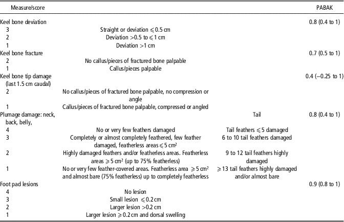 Table 2 Scoring systems for keel bone damage, plumage damage and foot pad lesions of laying hens and achieved pairwise inter-assessor agreement between 12 assessors