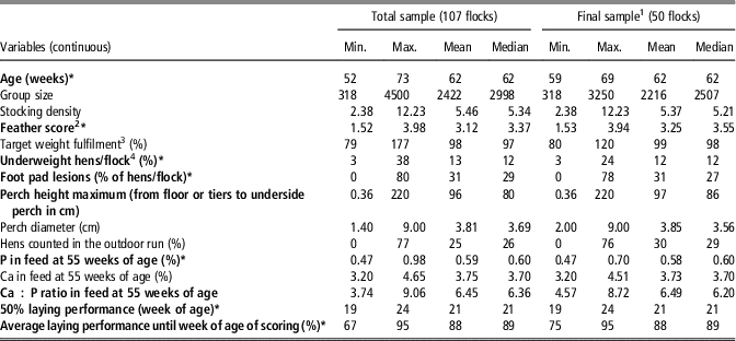 Table 3 Range (minimum, maximum), mean and median of potential metric risk factors regarding keel bone damage in laying hens for the total and the final sample