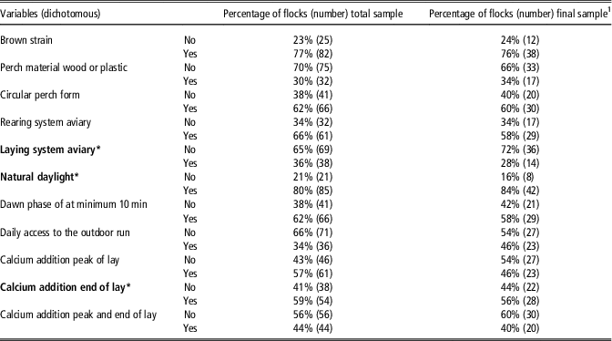 Table 4 Distribution of flocks with regard to potential dichotomous risk factors concerning keel bone damage in laying hens for the total and the final sample