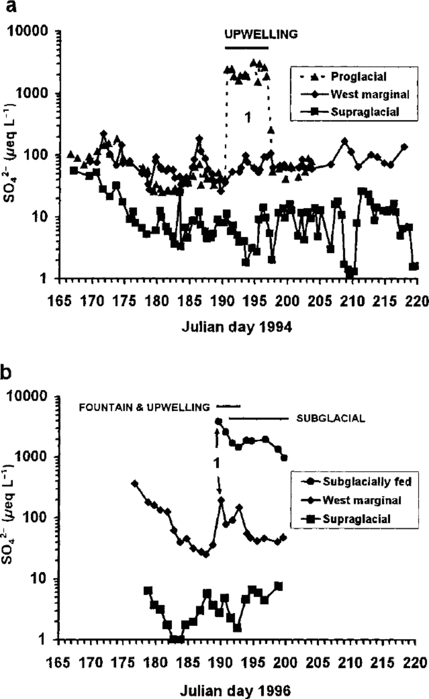 The SO4 2– concentration therefore acts as a tracer for subglacially routed waters. In 1994, the SO4 2– concentration in the proglacial stream increased markedly onJD191 (10 July) (Fig. 2a). This reflects the input of upwelling waters of subglacial origin. The SO4 2– concentration remained high throughout the period of upwelling input (JD 191-196) and returned to previous levels when this input ceased. Neither the west-marginal nor supraglacial streams showed any significant change in SO4 concentrations during this period. In 1996, however, elevated SO4 levels were recorded in the west-marginal stream when subglacial drainage via the fountain and upwelling streams was initiated (JD 189) (Fig. 2b). SO4 2– concentrations remained higher than the background for the next three days, suggesting that there was input of subglacial waters into the marginal stream throughout that period. Thus, the SO4 2– data provide evidence for a link between the subglacial reservoir and west- marginal streams in 1996 which was not evident in 1994.