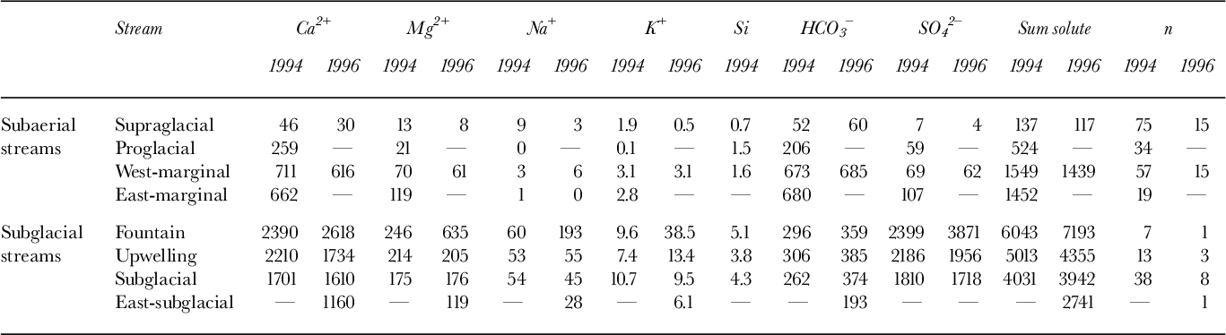 Firm evidence for the occurrence of subglacial drainage at John Evans Glacier is provided by observations of meltwater chemistry made in both 1994 and 1996. In both years, turbid water with a distinctive chemical composition emerged from the glacier at three discrete locations (Fig. 1b; Table 1): (1) by an artesian fountain 1–2 m high, located on the glacier surface about 200 m from the terminus, where ice was ~30 m thick (the “fountain” stream); (2) by upwelling through proglacial sediments over an area ~30 m wide immediately in front of the glacier terminus (the “upwelling” stream) and (3) as a channelized flow located at the ice—bed interface (the “subglacial” stream). (~1500 µeq L—1 ; Table 1), and (2) the higher concentrations of ionic species (Na+, K+ and Si) that are products of silicate mineral weathering. This implies that the turbid waters were routed subglacially, which is consistent with observations on the pattern of water outflow.