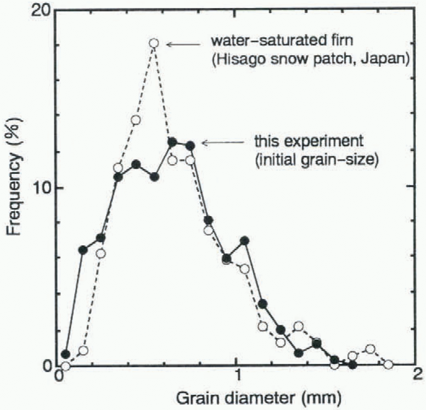 1). The frequency distribution of samples closely resembles that of the water-saturated firn which we obtained at Hisago perennial snow patch, Japan, in June 1986.