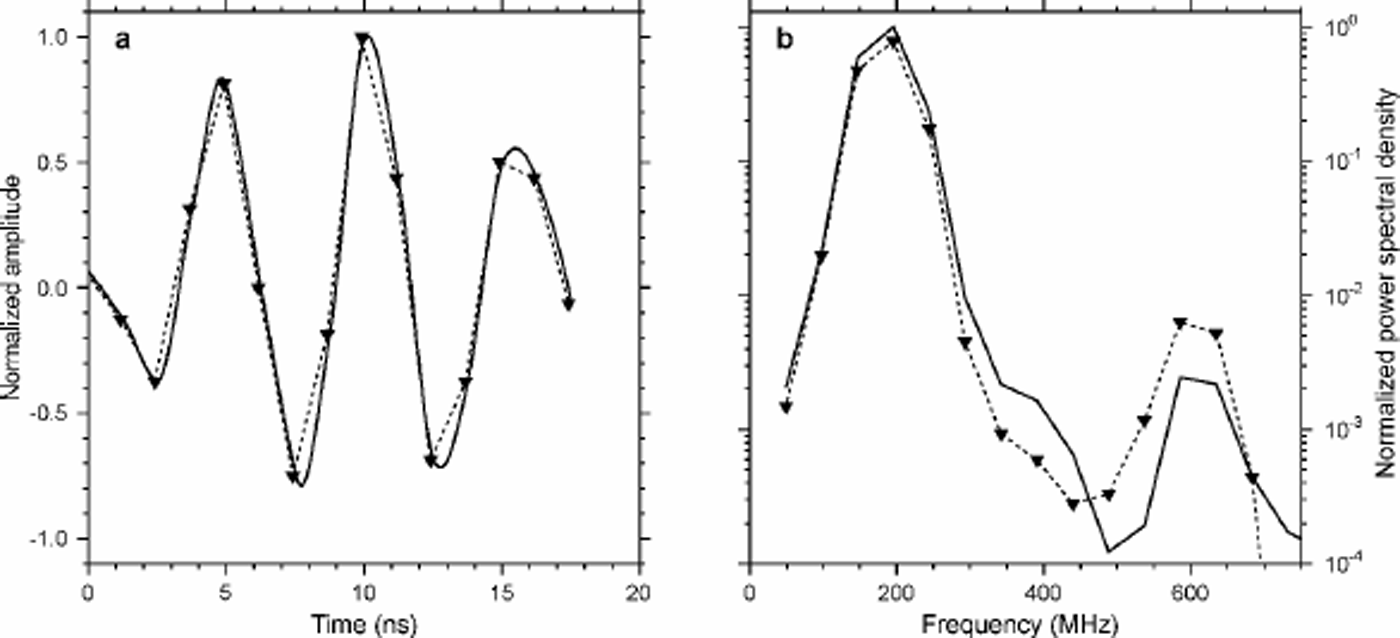 Fig. 3. Time-domain signals (a) and power spectrum (b) of the raw-data wavelet (thin dashed determined line with triangles) from an internal reflection, and the interpolated resampled wavelet used for the convolution (thick line).