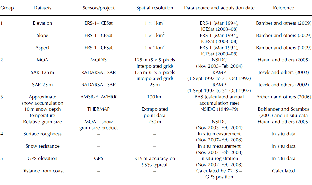 Group 3 – remotely sensed snow properties derived from remote-sensing data using existing algorithms for parameter retrieval: (1) estimated snow accumulation (kg m−2 ä−1) produced by interpolation of field measurements and satellite images from the Advanced Microwave Scanning Radiometer for Earth Observing System (AMSR-E) and Advanced Very High Resolution Radiometer (AVHRR) instruments (Reference Arthern, Winebrenner and VaughanArthern and others, 2006); (2) interpolated map of field-measured snow temperature at 10m depth using the THERMAP dataset (Reference Bohlander and ScambosBohlander and Scambos, 2001); (3) map of the relative optical grain size retrieved from the MODIS sensor with a spatial resolution of 750 m (Reference Haran, Bohlander, Scambos and FahnestockHaran and others, 2005).