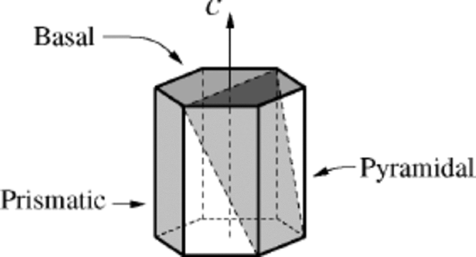 Fig. 1 Sketch of a single ice crystal in the form of a right hexagonal prism. Three types of crystallographic planes are indicated.