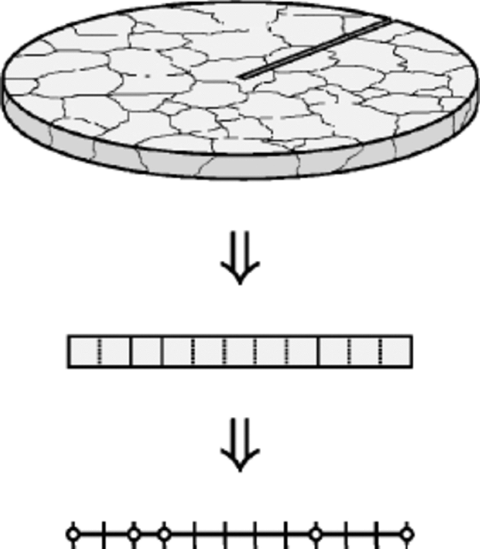 Fig. 2 Top: model of ice sample employed in the CA simulation. the diameter is approximately that of an ice core (=10 cm), while the thickness is assumed to be many orders of magnitude smaller than this. Centre: radial slice of the sample. Cell divisions (dashed lines) and grain boundaries (solid lines) are presented. Bottom: one-dimensional representation of the sample used in the algorithm. Cell divisions (bars) and grain boundaries (circles) are indicated.